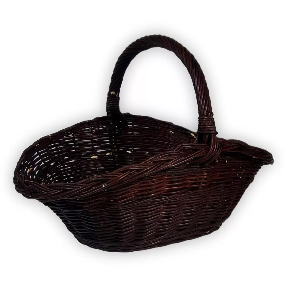 Színezett sötétbarna vesszőből fonott fahordó kosár.