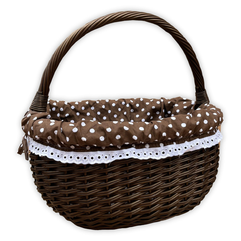 Barna színű bevásárló kosár pöttyös béléssel.