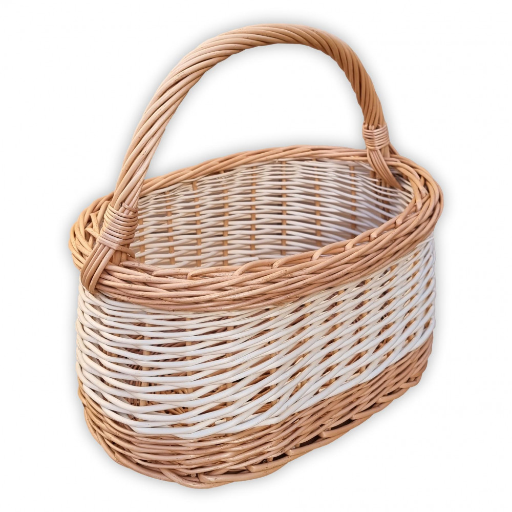 Vesszőből fonott fehér bevásárló kosár.