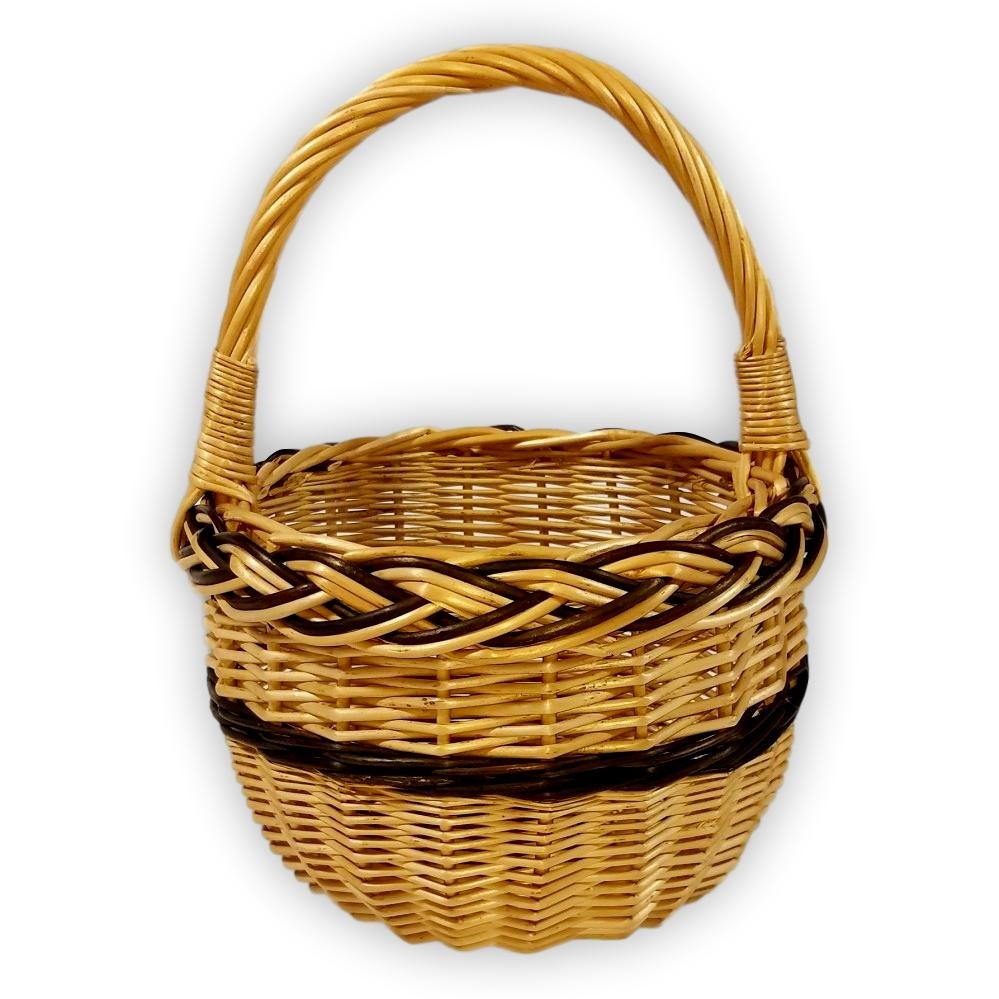 Vesszőből font, kerek alakú bevásárló kosár gyerekeknek, tetején sötét fonás mintázattal díszítve.