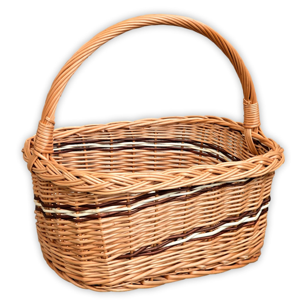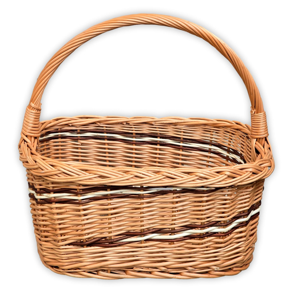 Szögletes alapú bevásárló kosár barna és fehér díszítéssel.