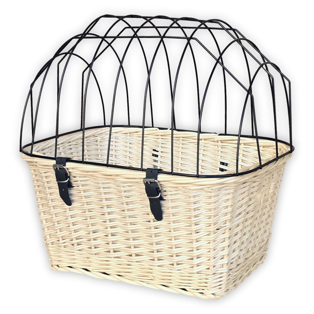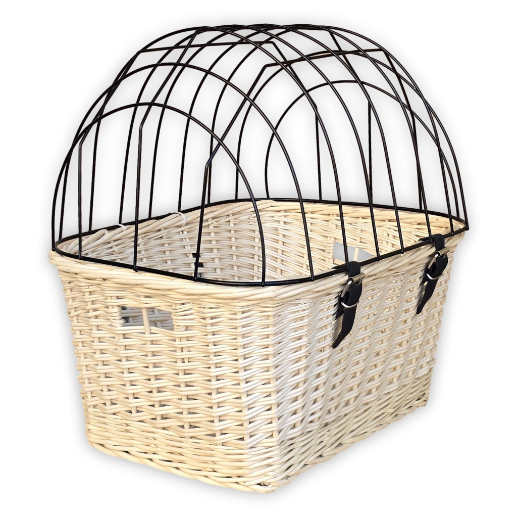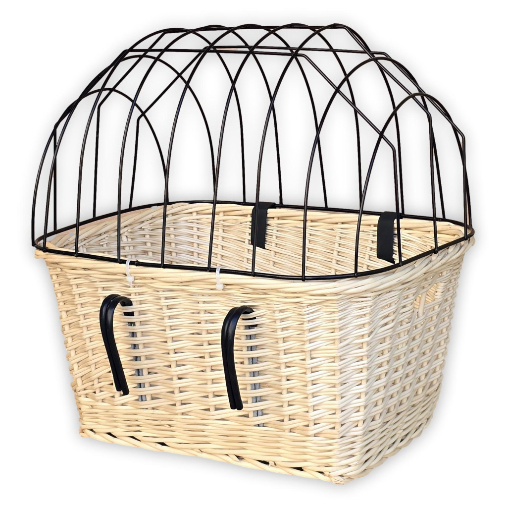 Ez a kézzel font, természetes fűzvesszőből készült kisállat szállító kosár praktikus és stílusos megoldás cicák és kisebb testű kutyák kerékpáros szállítására. A kosár stabilan rögzíthető a bicikli kormányára a kampók segítségével. A fémrácsos tető biztonságosan zárható, így megakadályozza, hogy kedvencünk kiugorjon tekerés közben.