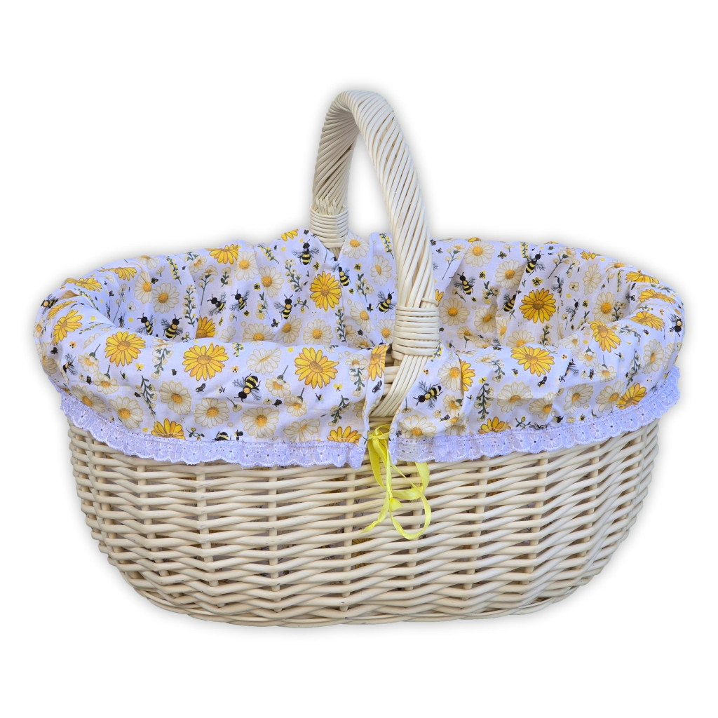Fehér színű bevásárló kosár sárga virág mintás béléssel.