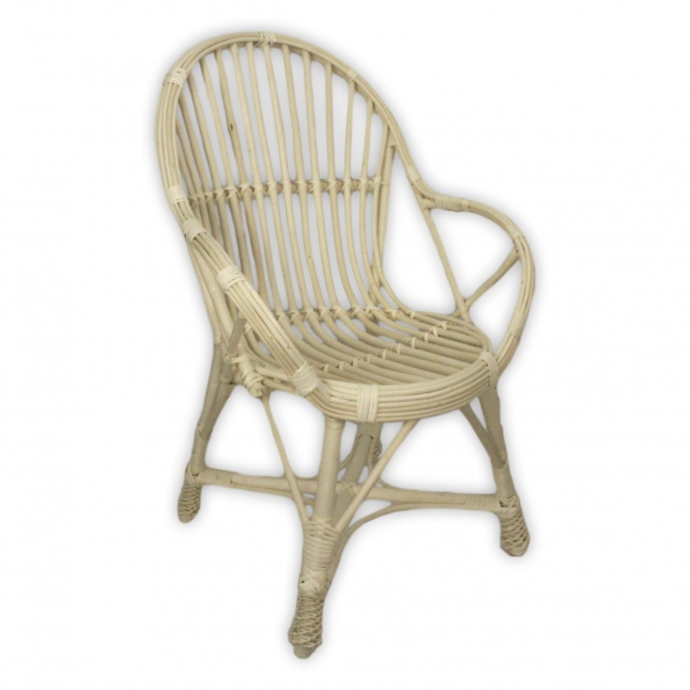 Masszív, pálcás vesszőfotel karfával fehér színben. Mérete és fazonja miatt teraszra vagy kertbe ajánljuk.