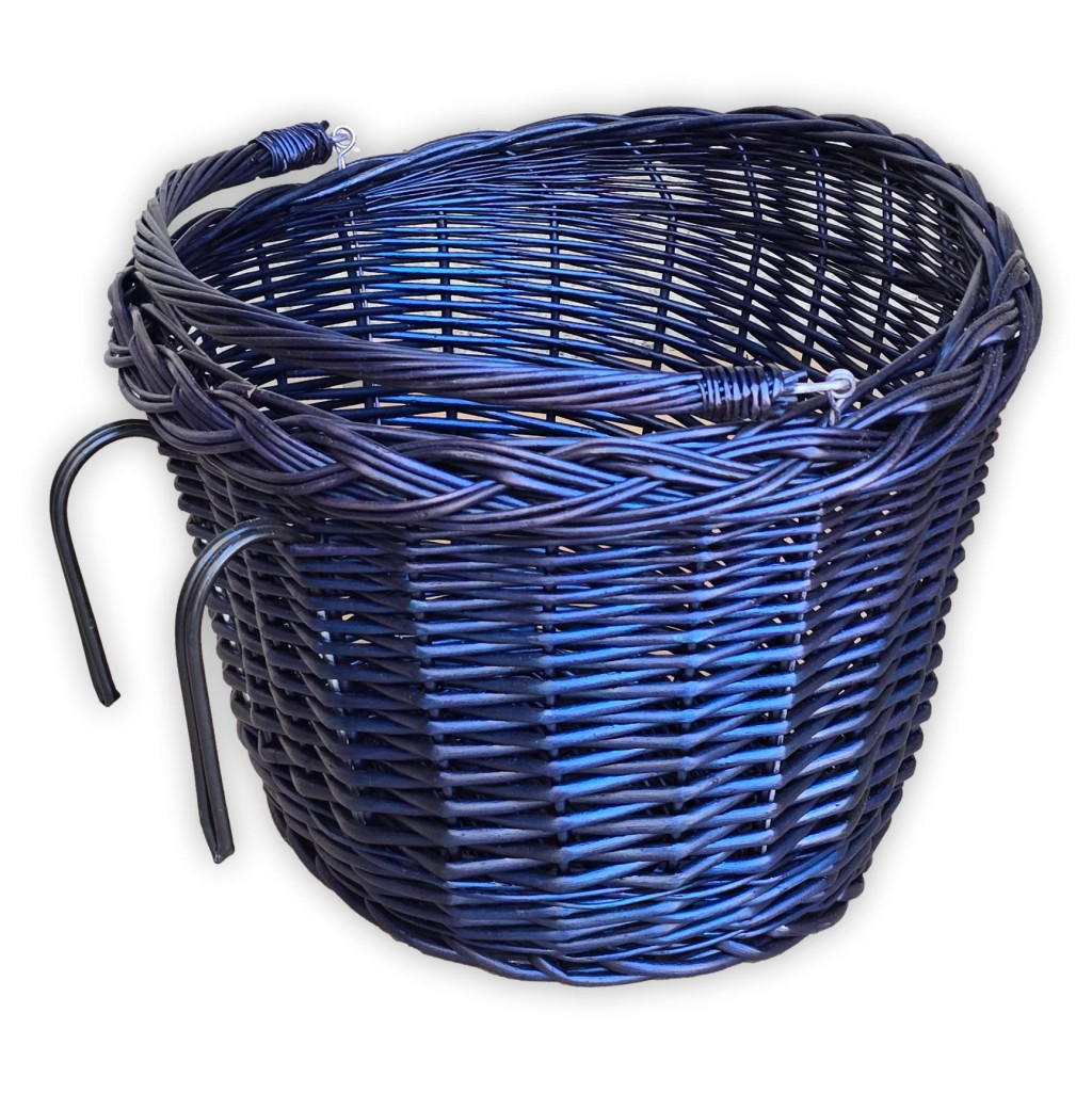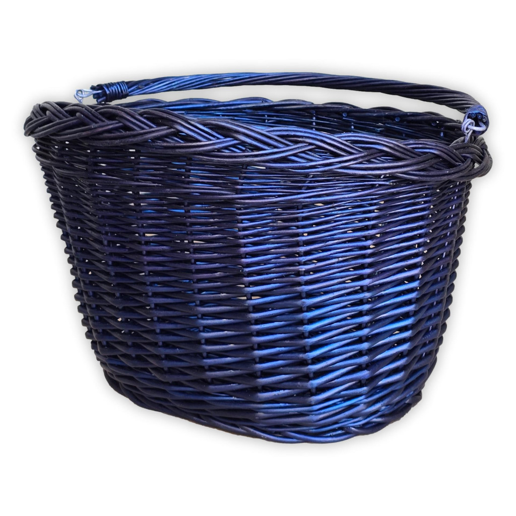 Kormányra akasztható, ovális, fonott kerékpár kosár, lehajtható füllel.