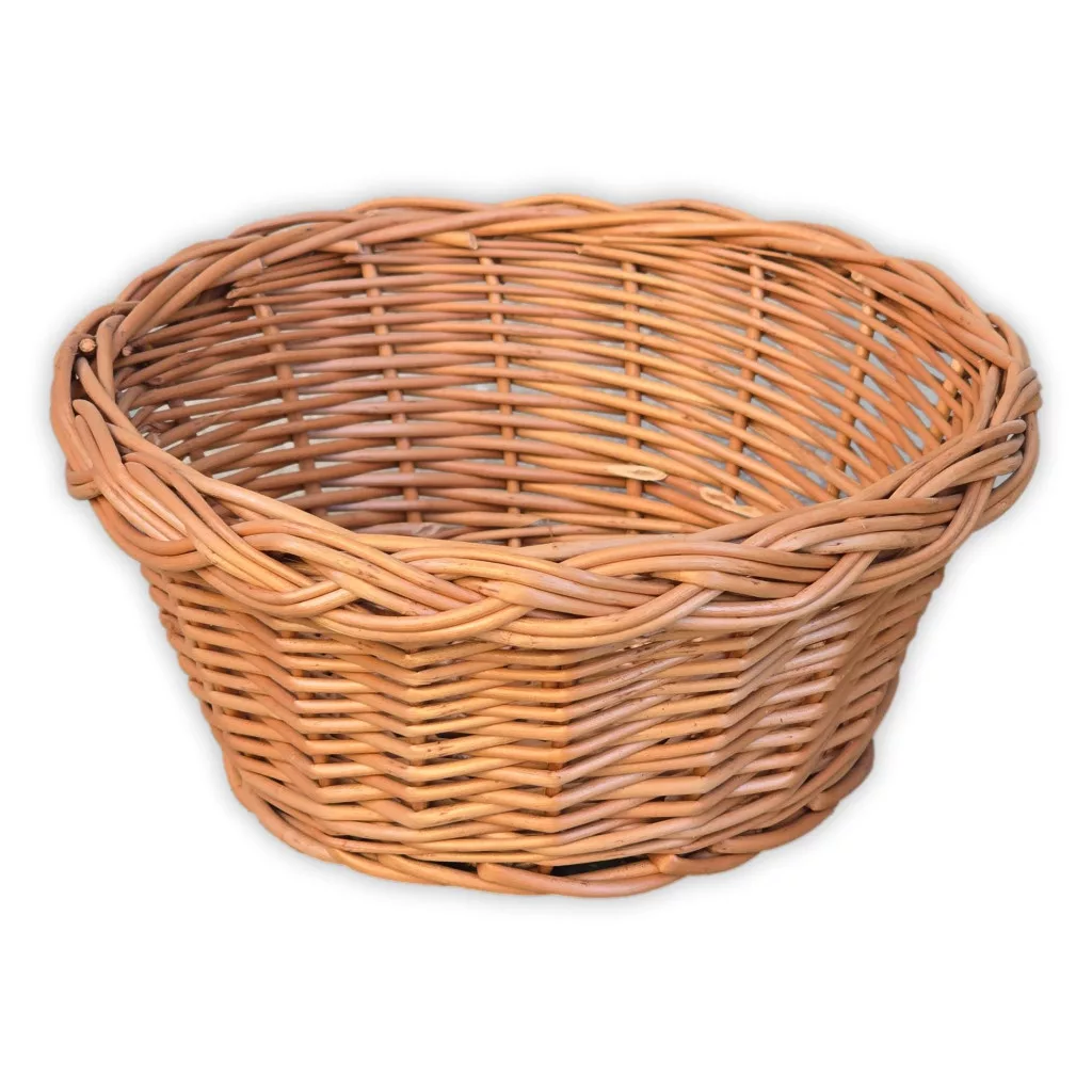 Kerek alakú kínáló tálka kosár tetején szép fonással.