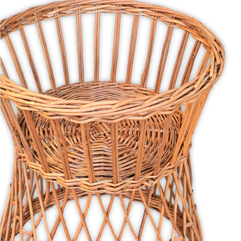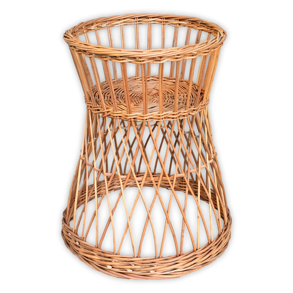 Vesszőből fonott homokóra formájú virágtartó állvány.