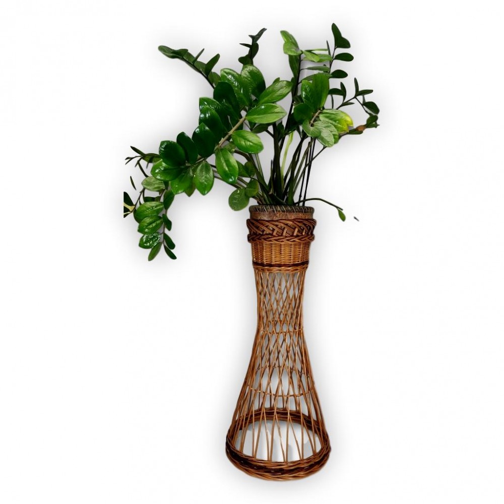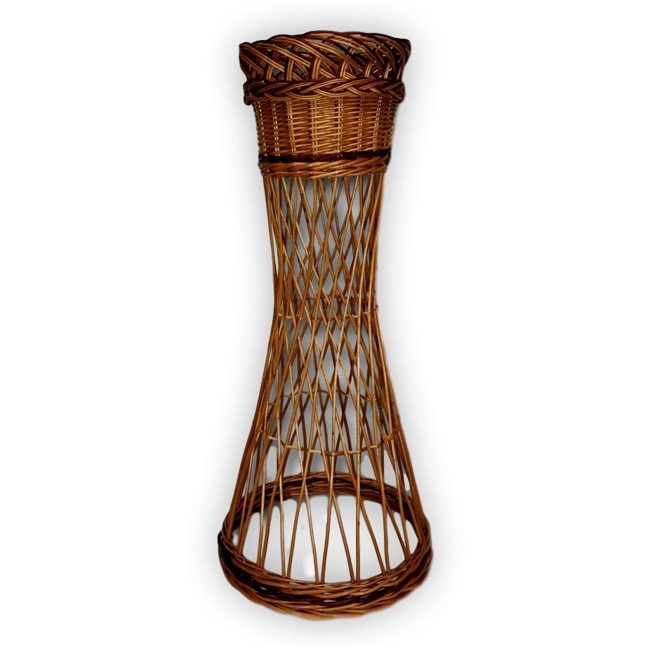 Vesszőből fonott homokóra formájú, mutatós virágtartó vörös csipkeszegéllyel. A tetején cserépnek kialakított hellyel.