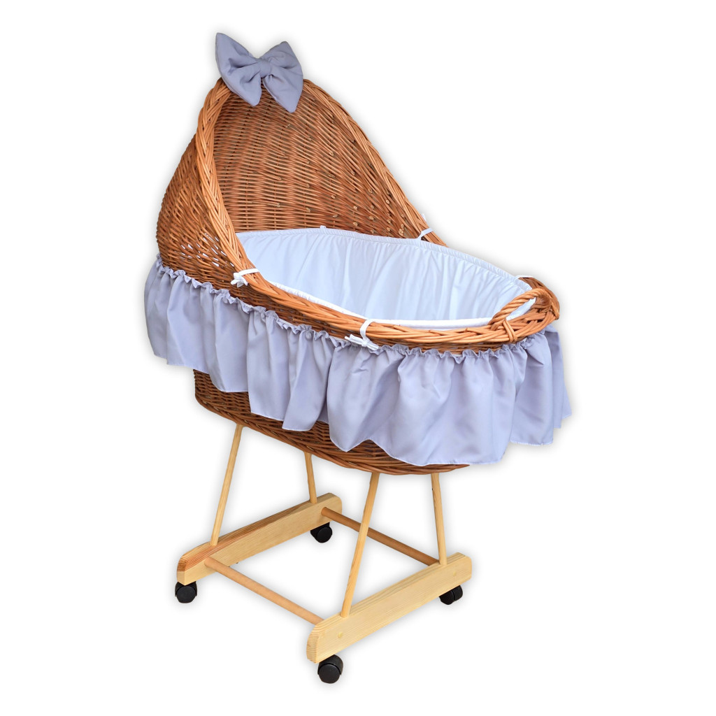 Nagy méretű, kézzel font vessző bölcső kifejezetten újszülött babák számára készült. A természetes vessző meleg, otthonos hangulatot ad, a textil díszítés (fodros szoknya és masni) pedig igazán elegáns megjelenést biztosít – különösen jól mutat boho és natúr stílusú gyerekszobákban.