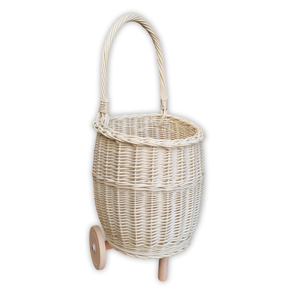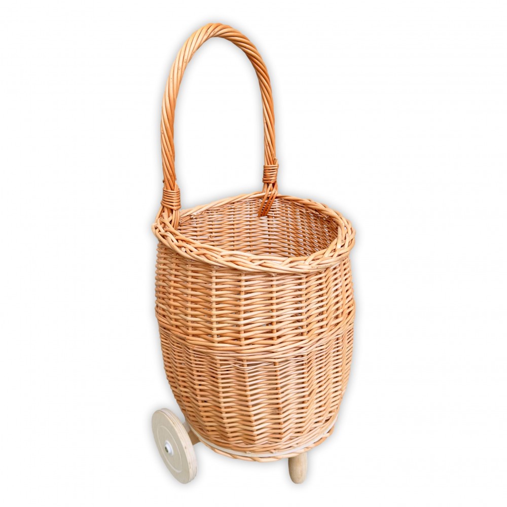 Vesszőből készült bevásárló kocsi gyerekeknek. A kosár feneke és kerekei fából készültek.