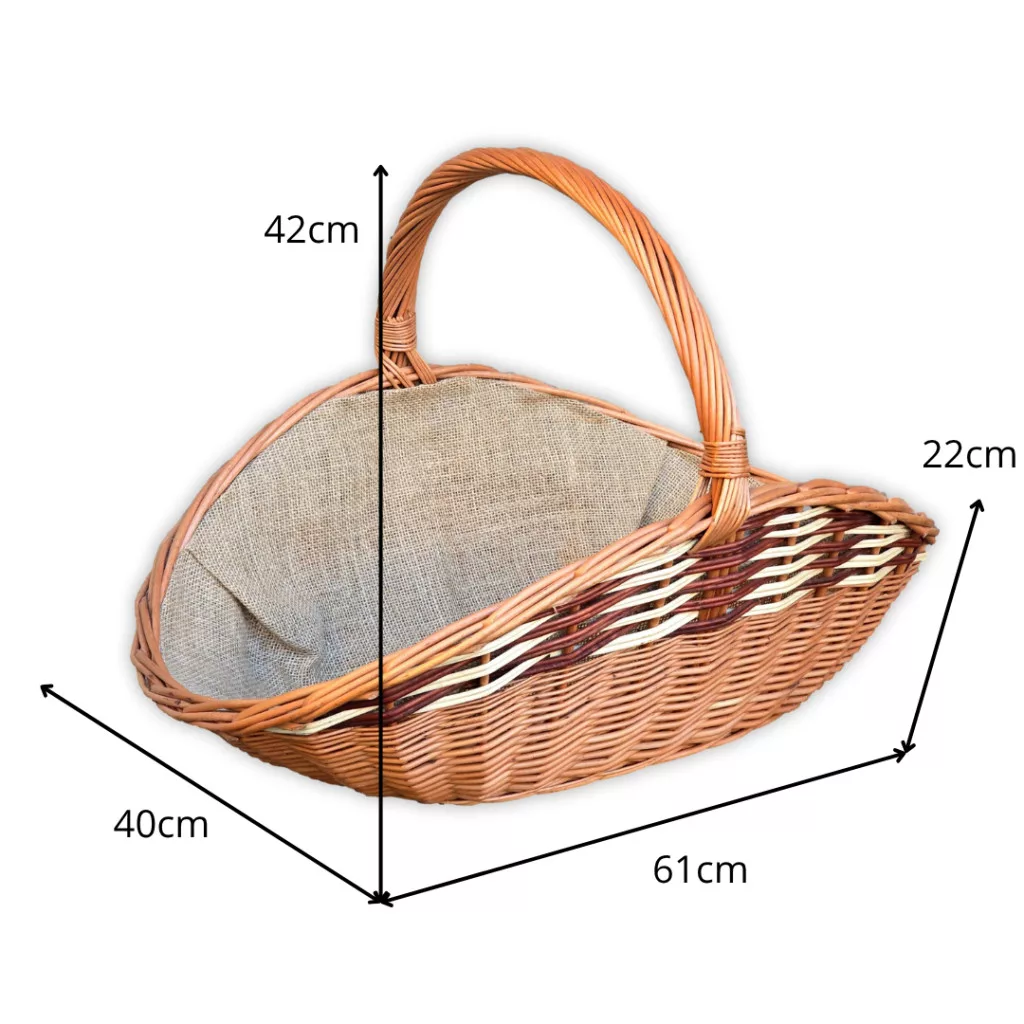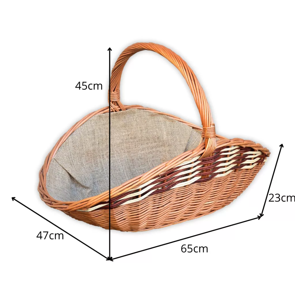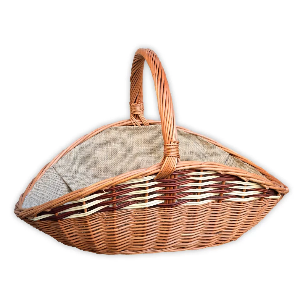 Kandalló kosár természetes vesszőből készült, amely tartósságot és rusztikus megjelenést biztosít. A belseje vászon anyaggal bélelt, amely megóvja a kosarat a szennyeződésektől. A kosár elsősorban tűzifa tárolására és szállítására szolgál, de esztétikus megjelenése miatt dekorációs elemként is jól használható a kandalló közelében.