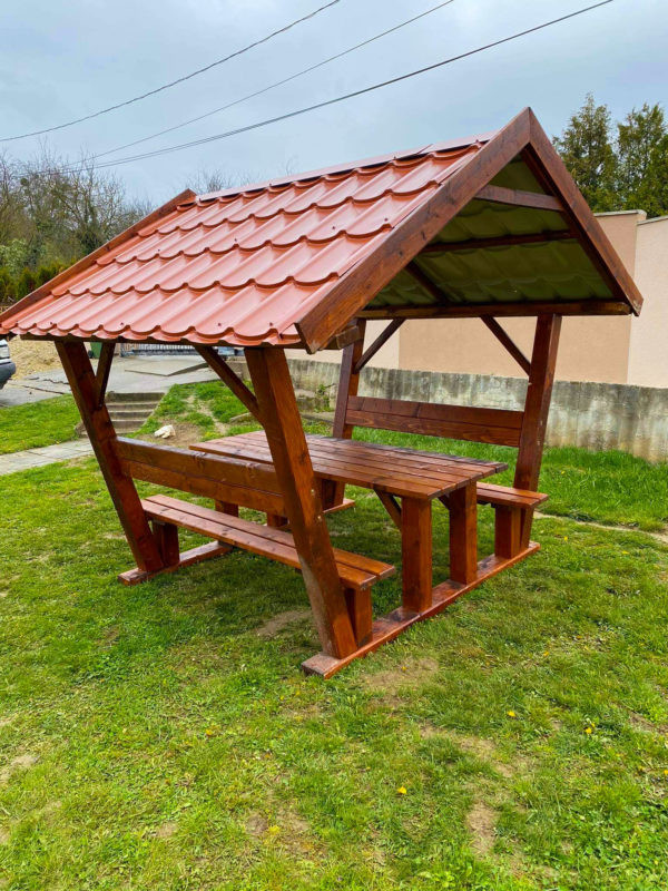 Lemeztetős kerti kiülő, szaletli rönk oszlopokkal.