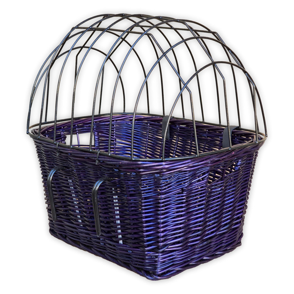Ez a kézzel font, természetes fűzvesszőből készült kisállat szállító kosár praktikus és stílusos megoldás cicák és kisebb testű kutyák kerékpáros szállítására. A kosár stabilan rögzíthető a bicikli kormányára a kampók segítségével. A fémrácsos tető biztonságosan zárható, így megakadályozza, hogy kedvencünk kiugorjon tekerés közben.