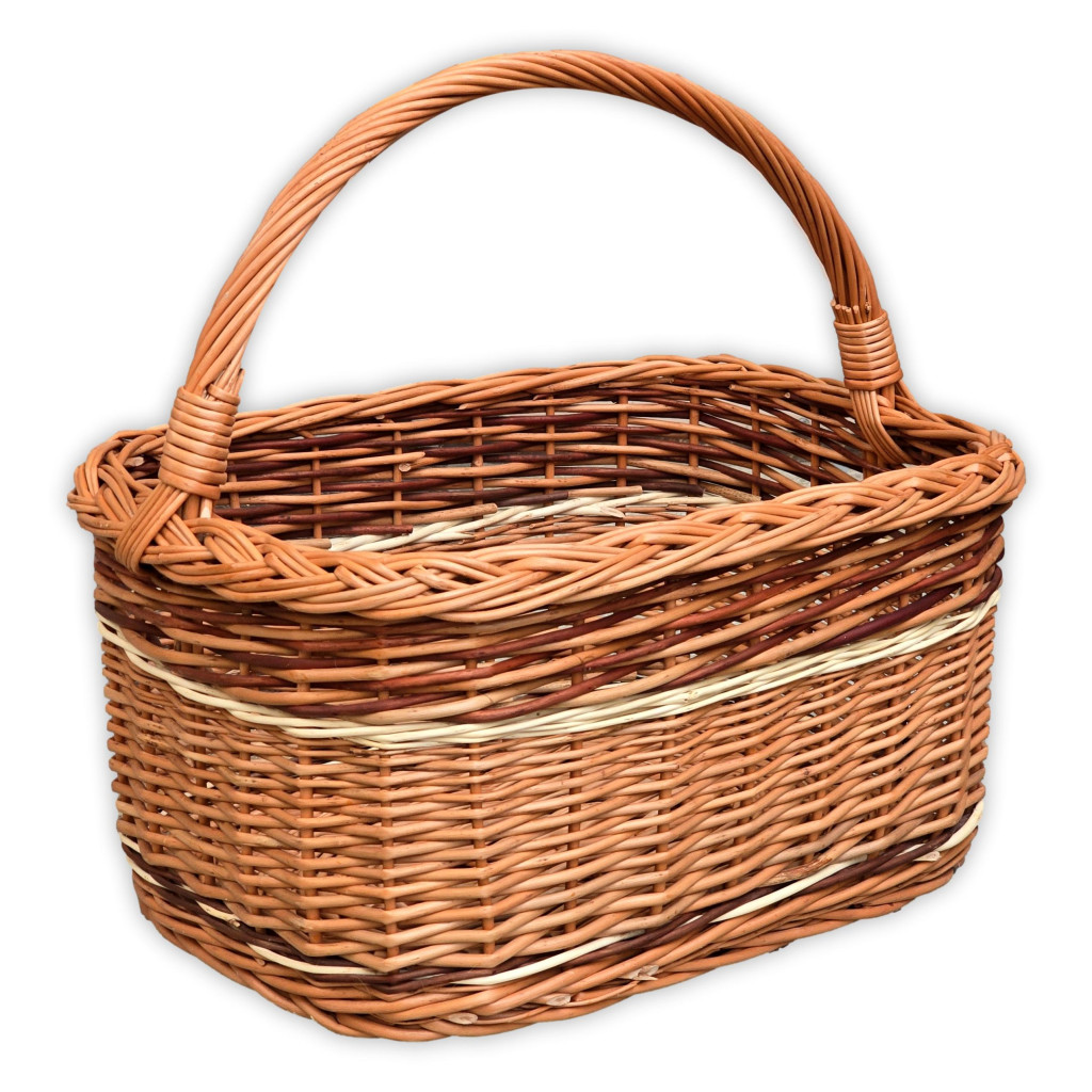 Vesszőből fonott, sarkított bevásárló kosár hosszanti füllel. Oldalán és alján barna szinű díszitéssel.