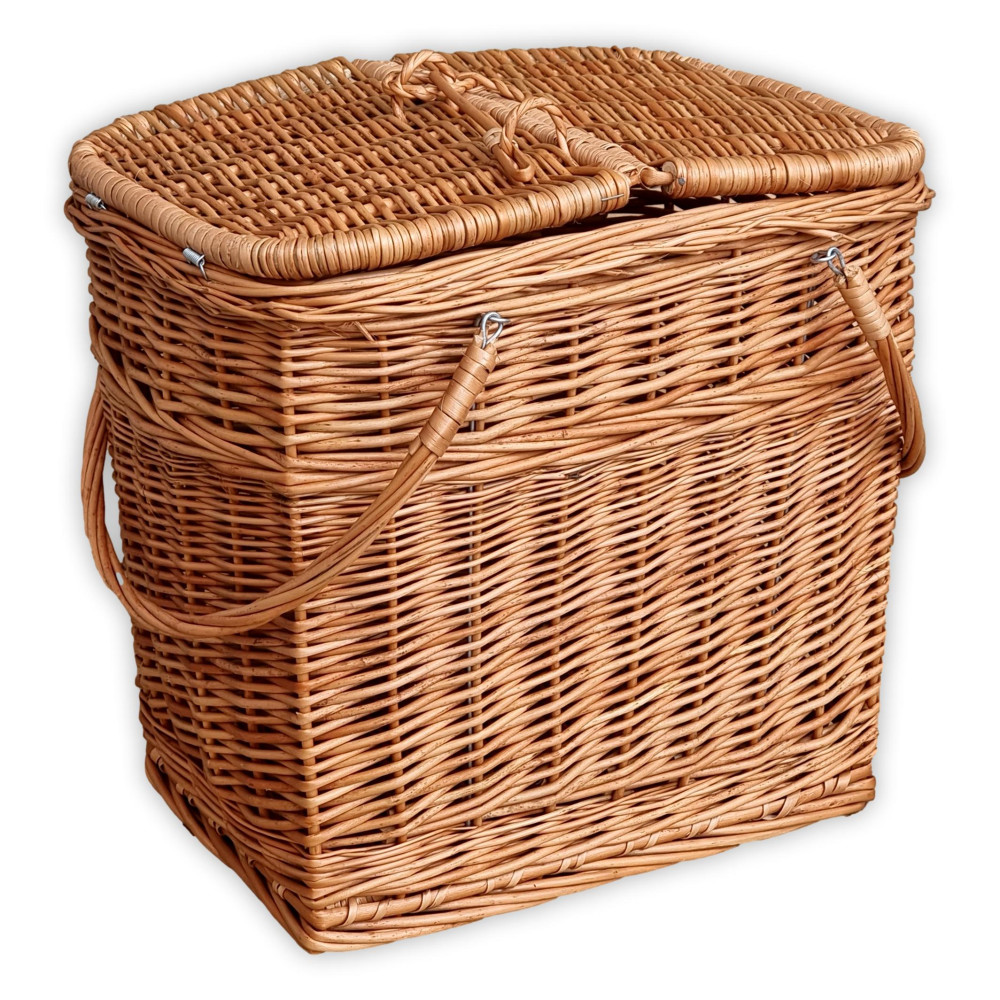 Vesszőből fonott piknik kosár, tetején nyitható fedéllel. Dupla füllel.