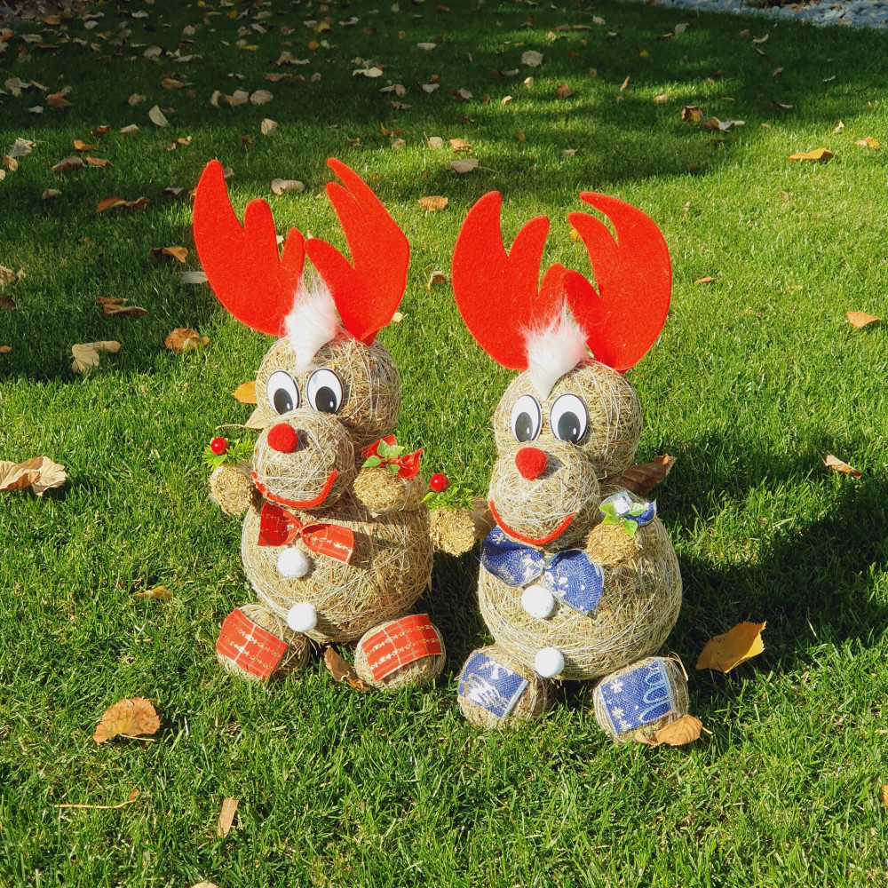 Szalmából készült rénszarvas, dekorációs figura színes díszítéssel.