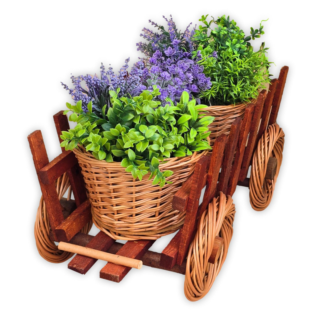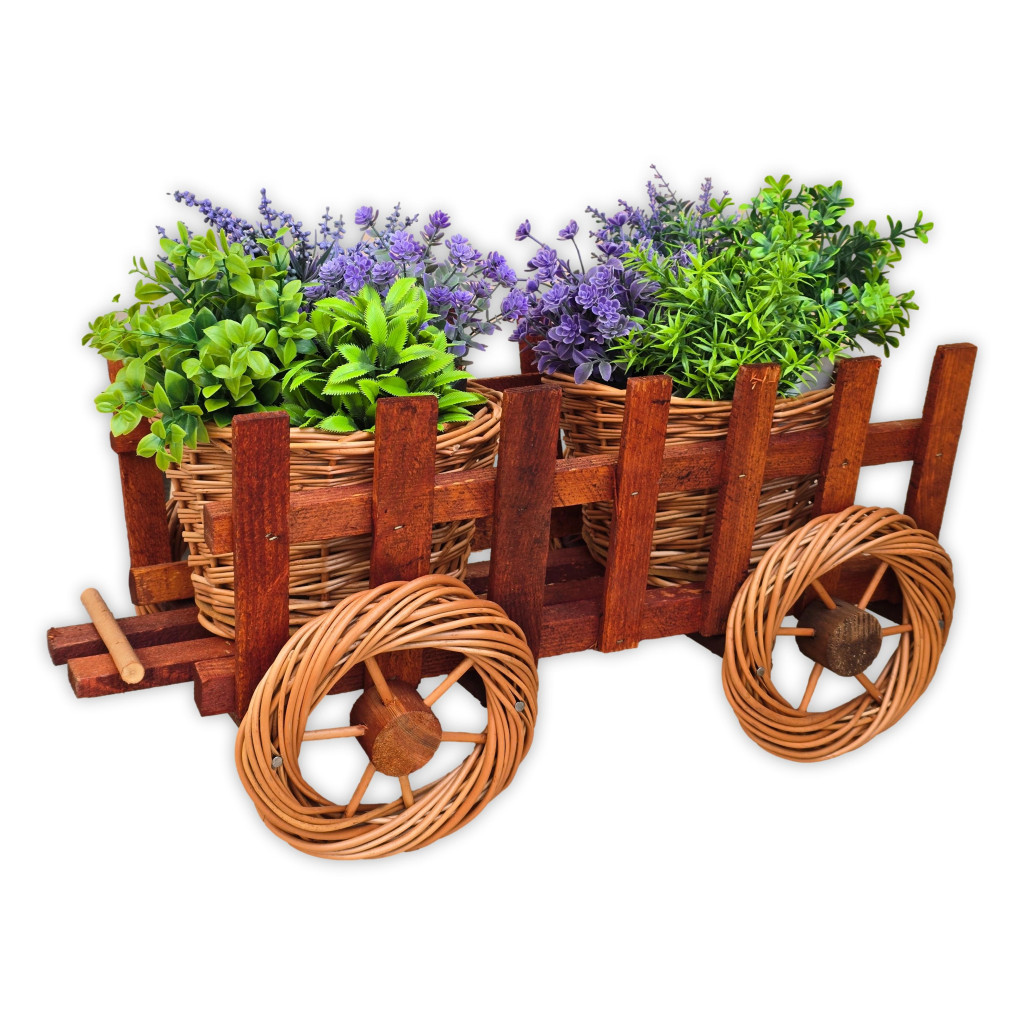 Vesszőből és fából, kézzel készített, két kaspós virágtartó pótkocsi.