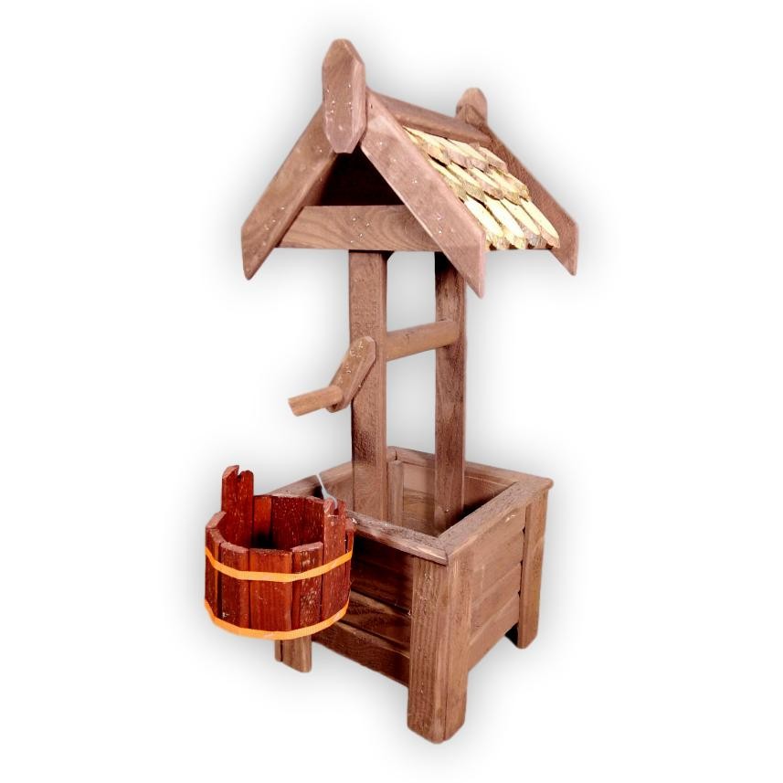 Fából kézzel készűlt kút formájú dekoratív virágtartó.