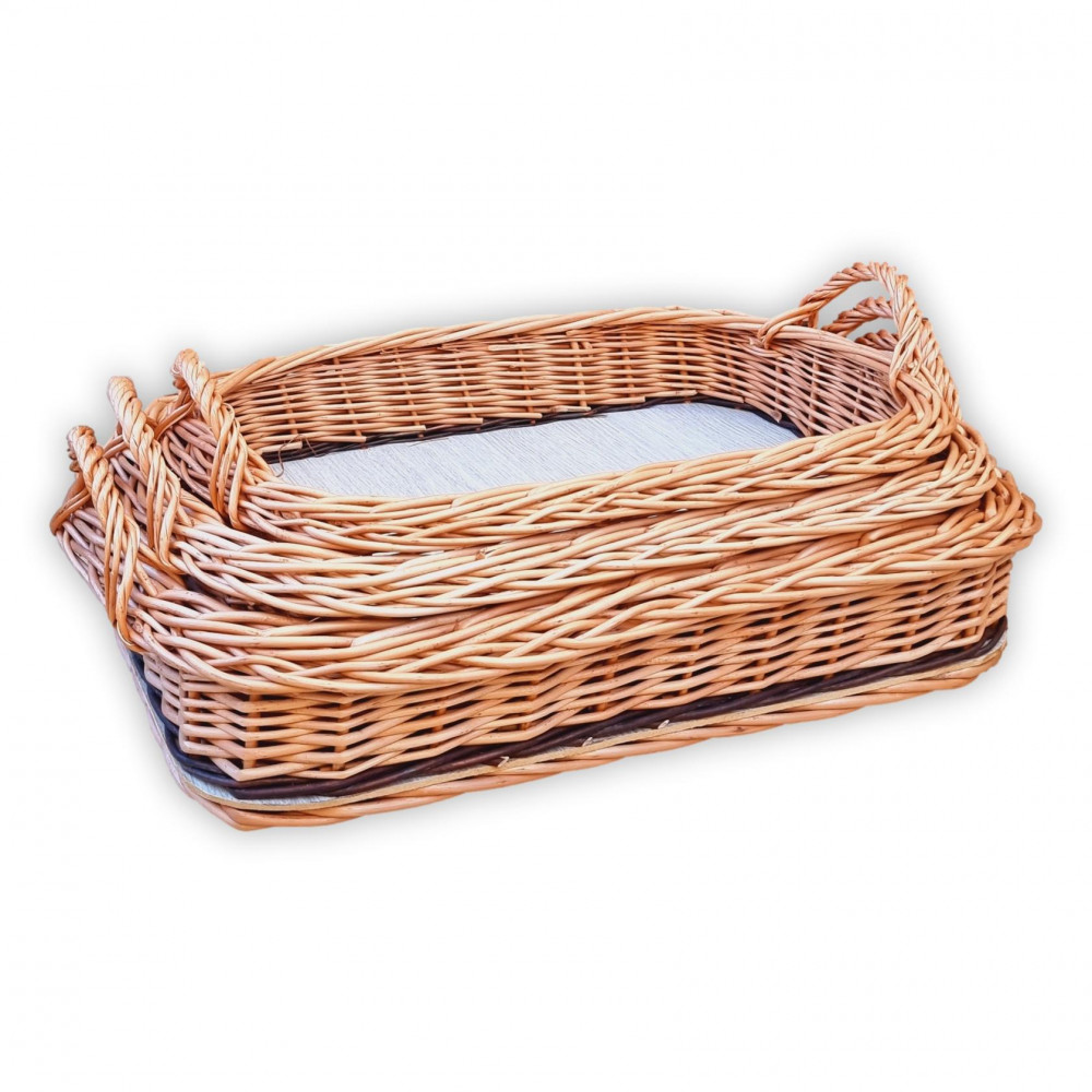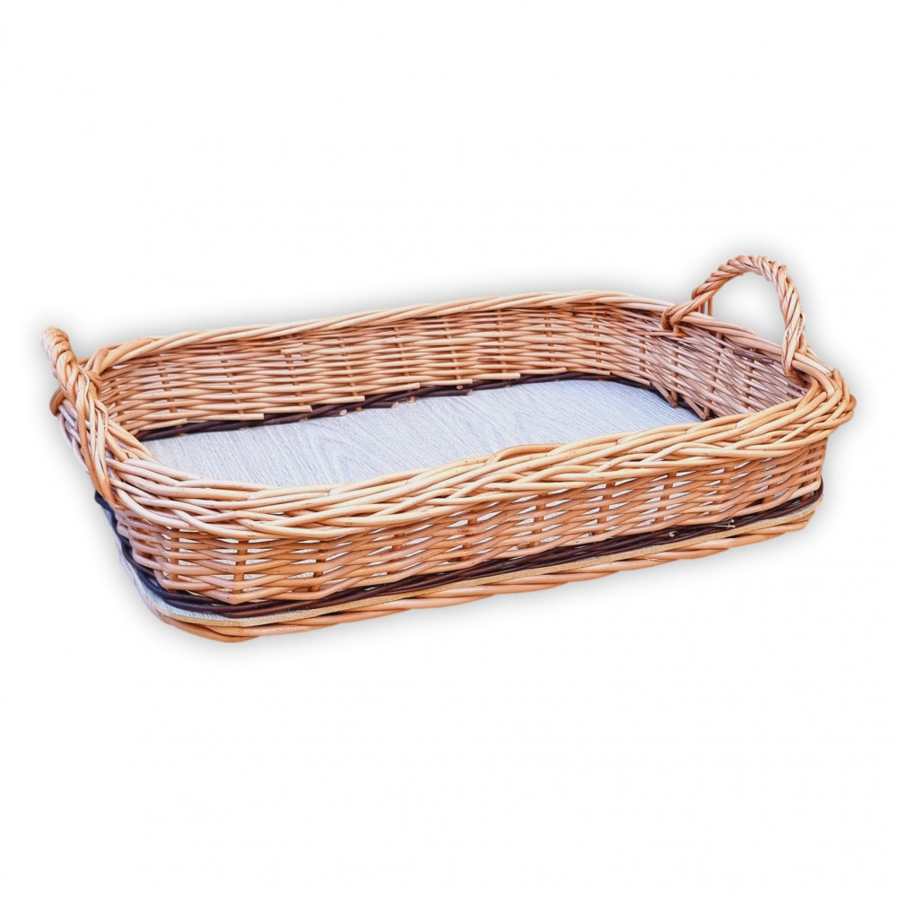 Rechteckiges Serviertablett aus Weide mit Griffen an beiden Seiten.