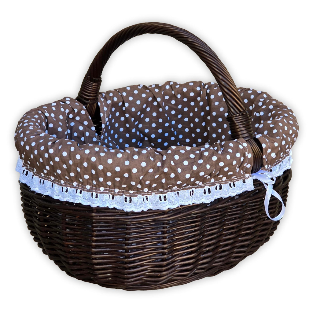Brauner Einkaufskorb mit gepunktetem Innenfutter.