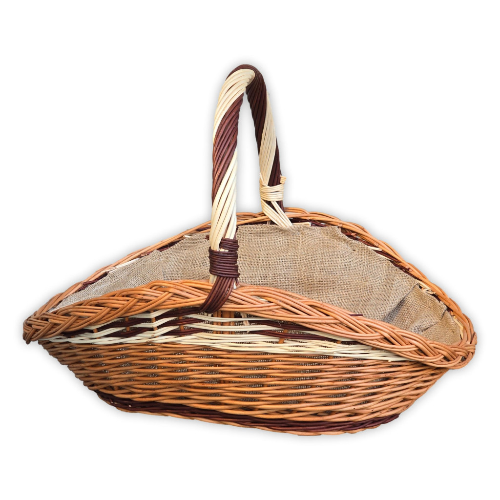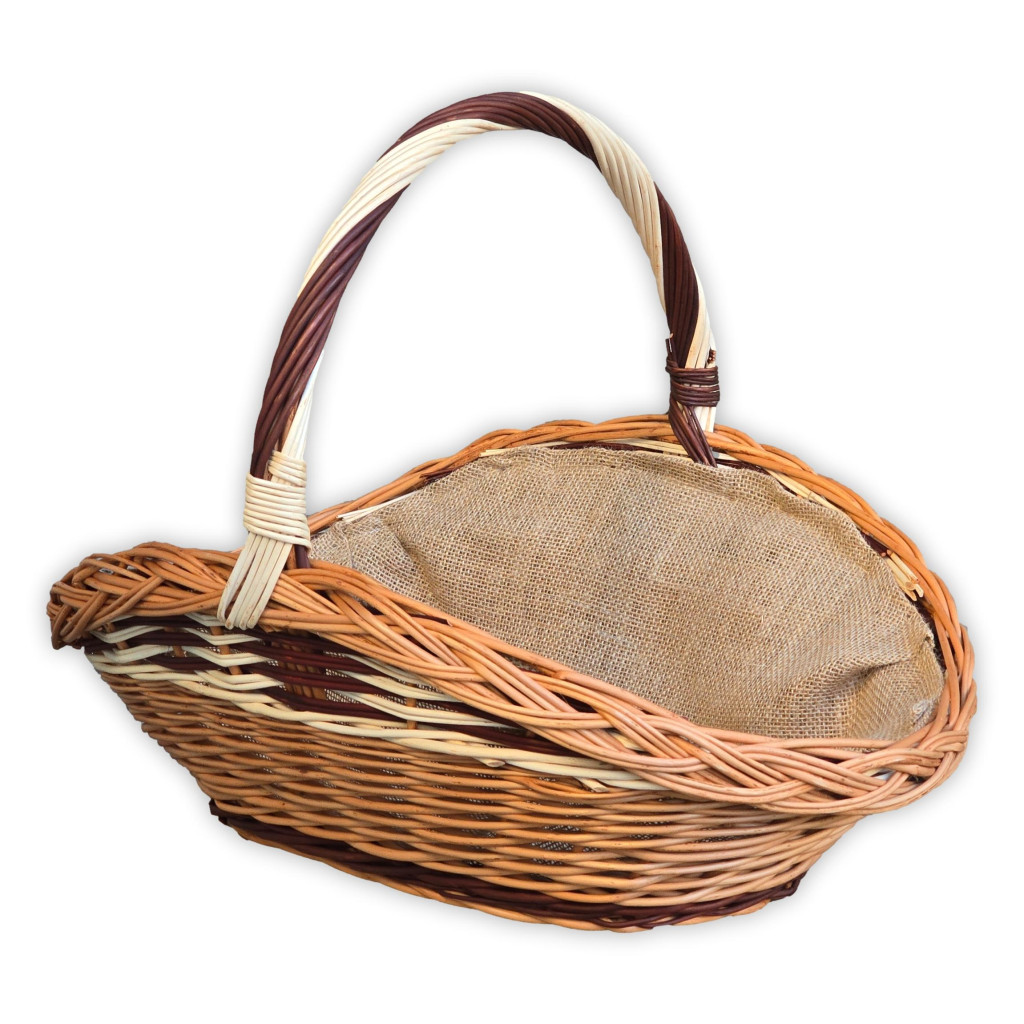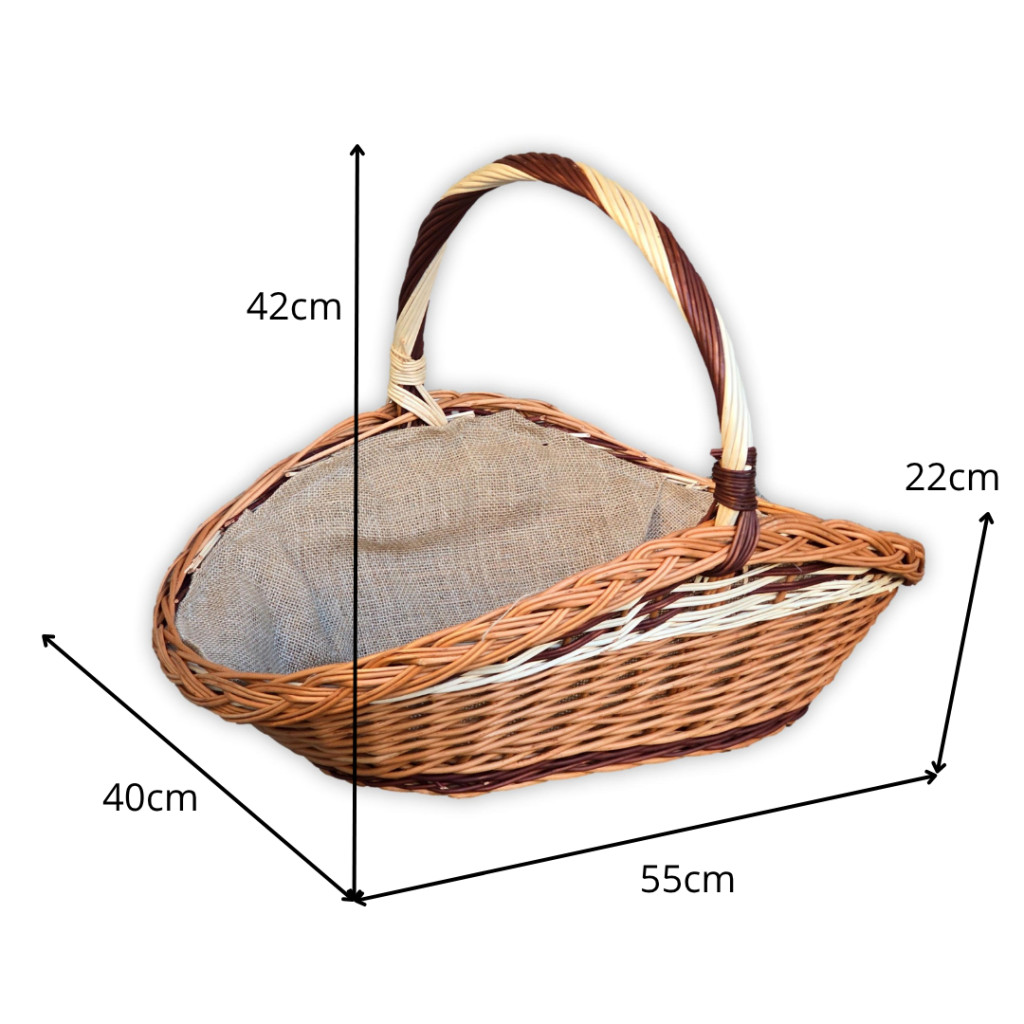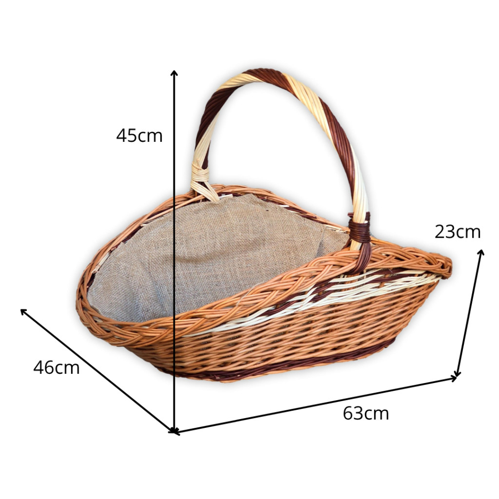 Kaminholzkorb aus natürlicher Weide, das Haltbarkeit und eine rustikale Optik bietet. Das Besondere an diesem Korb ist die Kronenflechtung oben, die als einzigartiges und dekoratives Element dient. Der Korb ist in mehreren Größen erhältlich, sodass er an die Größe des Kamins und die individuellen Lagerbedürfnisse angepasst werden kann. Das Innere ist mit Jutestoff ausgekleidet, der den Korb vor Schmutz schützt. Der Korb dient hauptsächlich zum Lagern und Transportieren von Brennholz, kann aber aufgrund seines ästhetischen Erscheinungsbildes auch als dekoratives Element in der Nähe des Kamins verwendet werden.