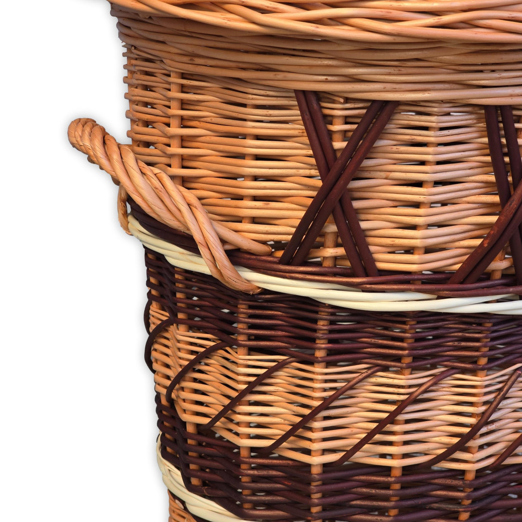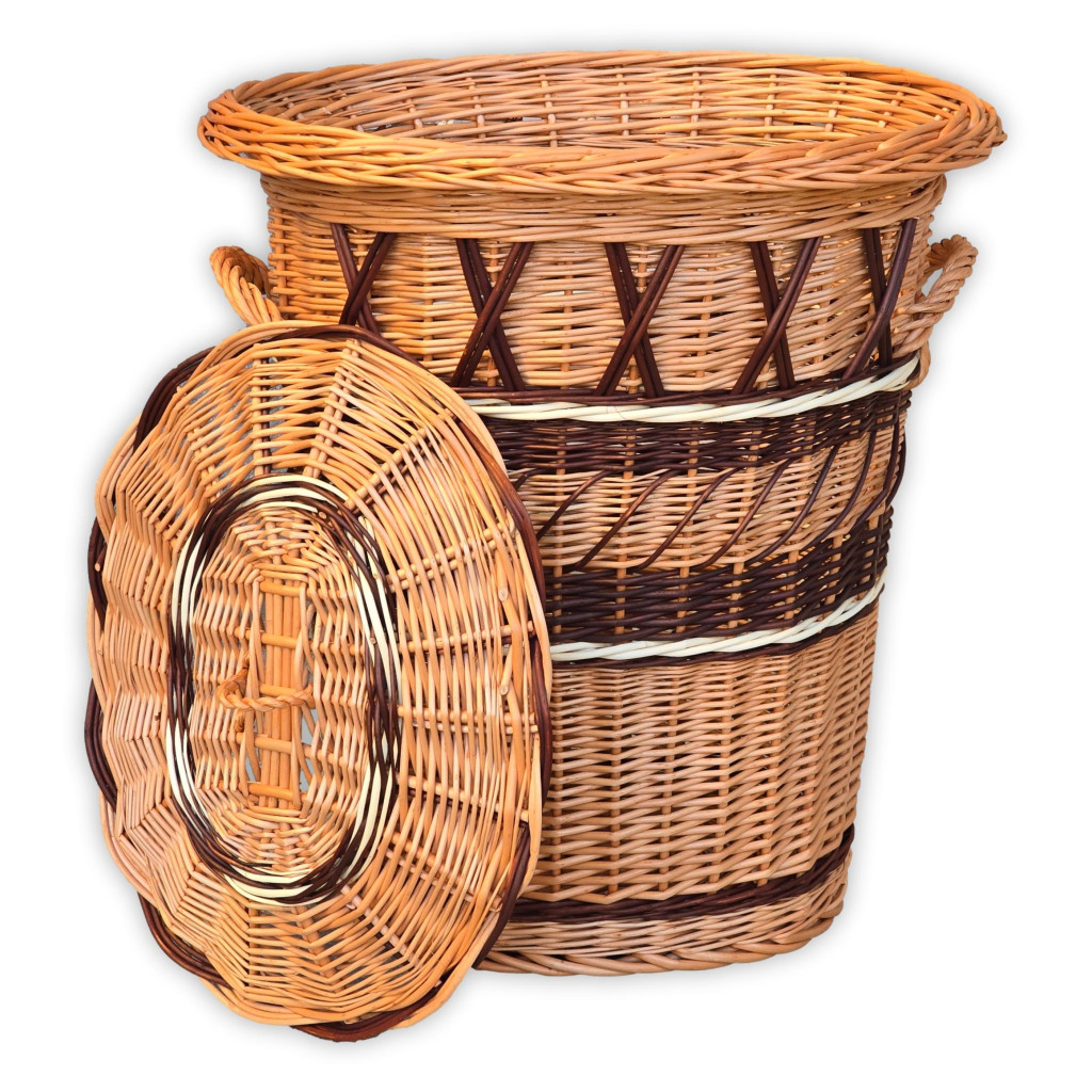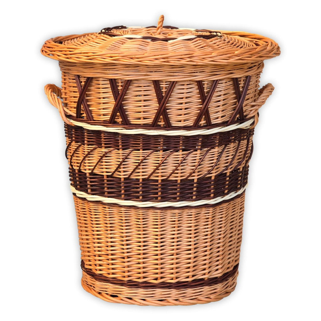 Ovaler Wäschekorb aus geflochtener Weide mit dekorativem Muster rundherum und Griffen an beiden Seiten.