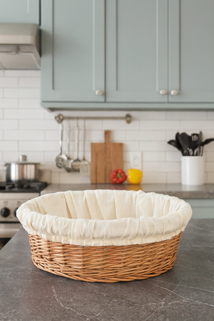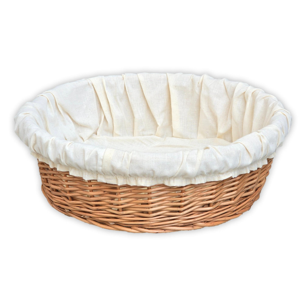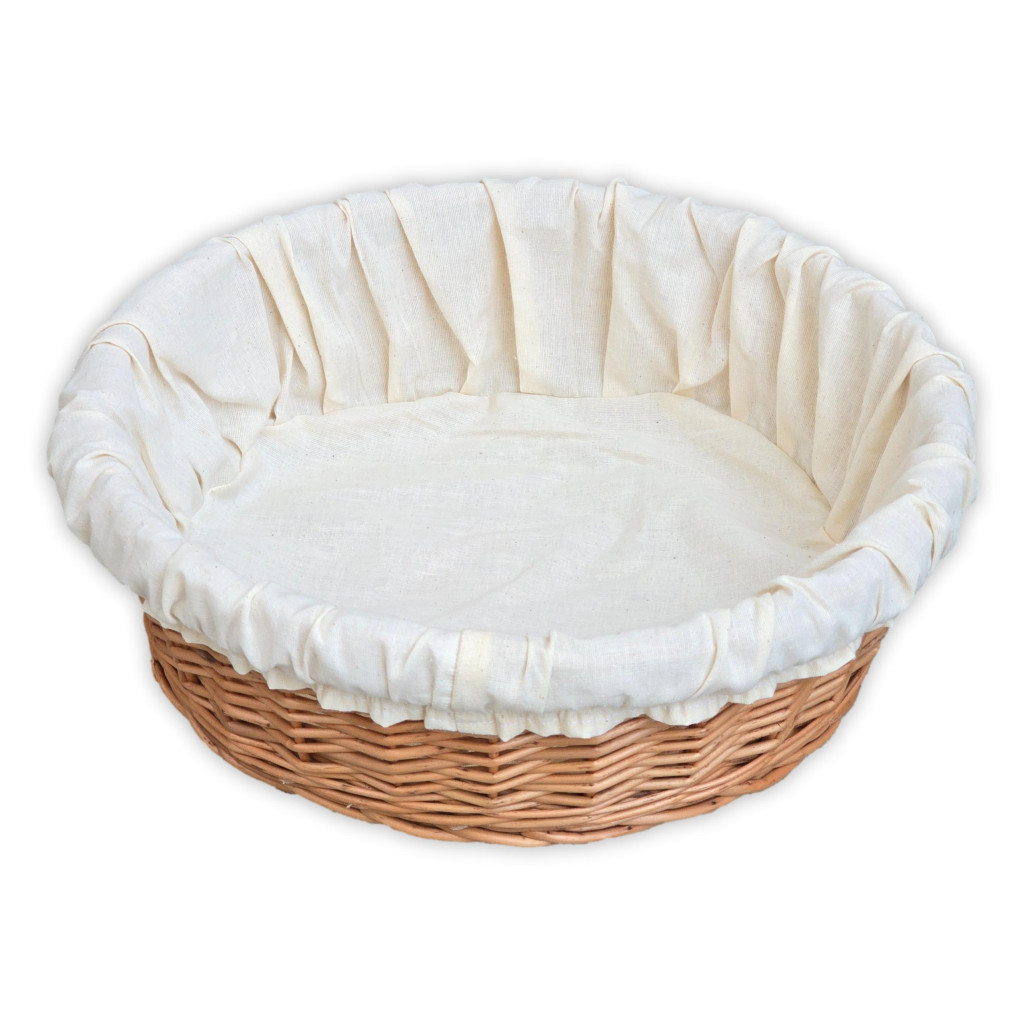 Runder geflochtener Aufbewahrungskorb mit Innenfutter aus naturfarbenem Leinen.