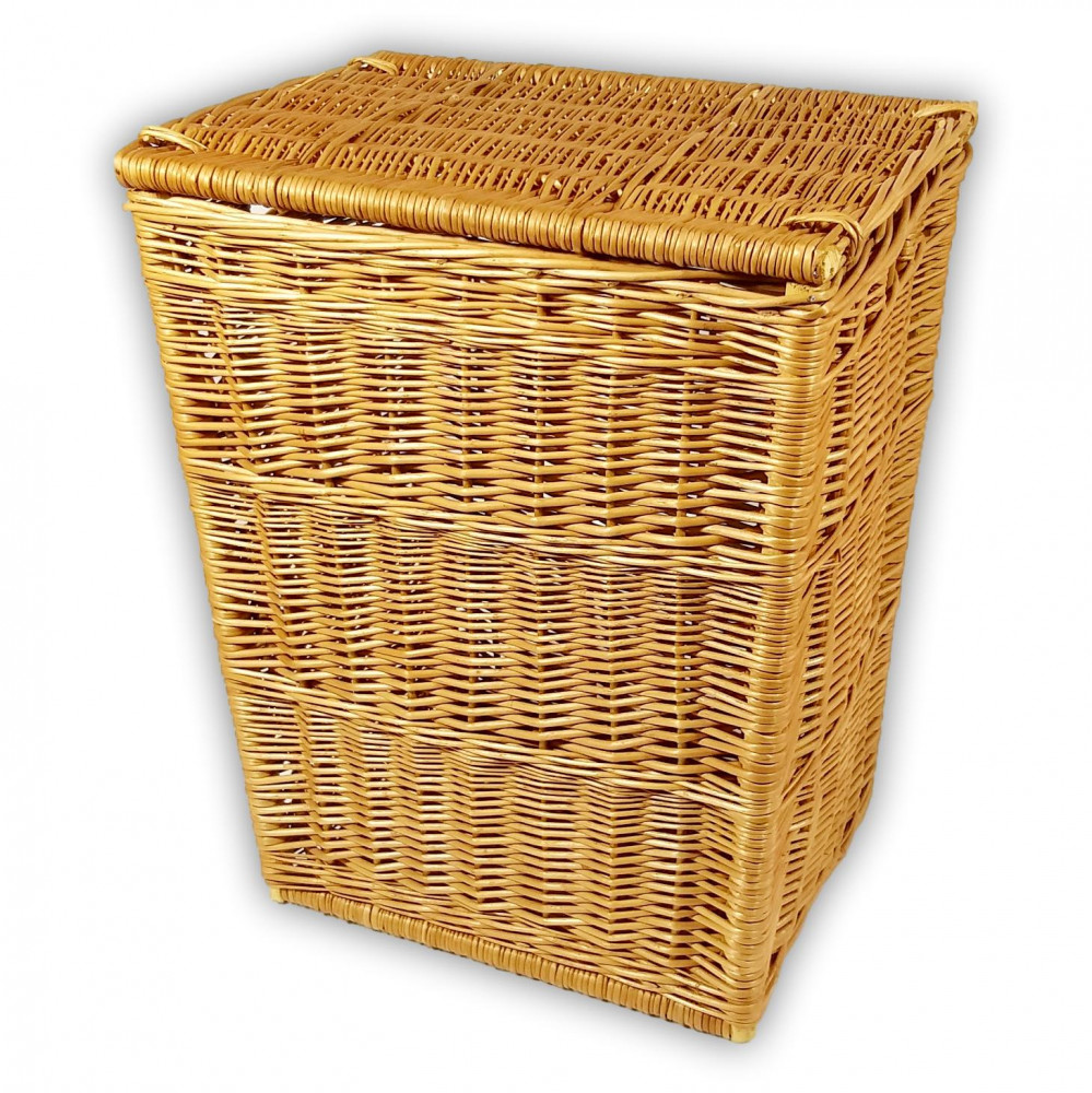 Quadratischer Wäschekorb aus Weide. Mit Griffen an beiden Seiten. Ränder mit Holz verstärkt.