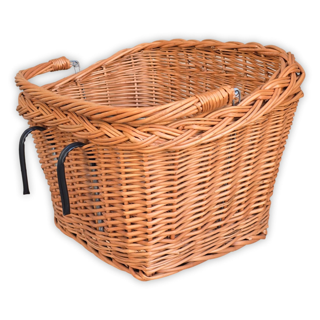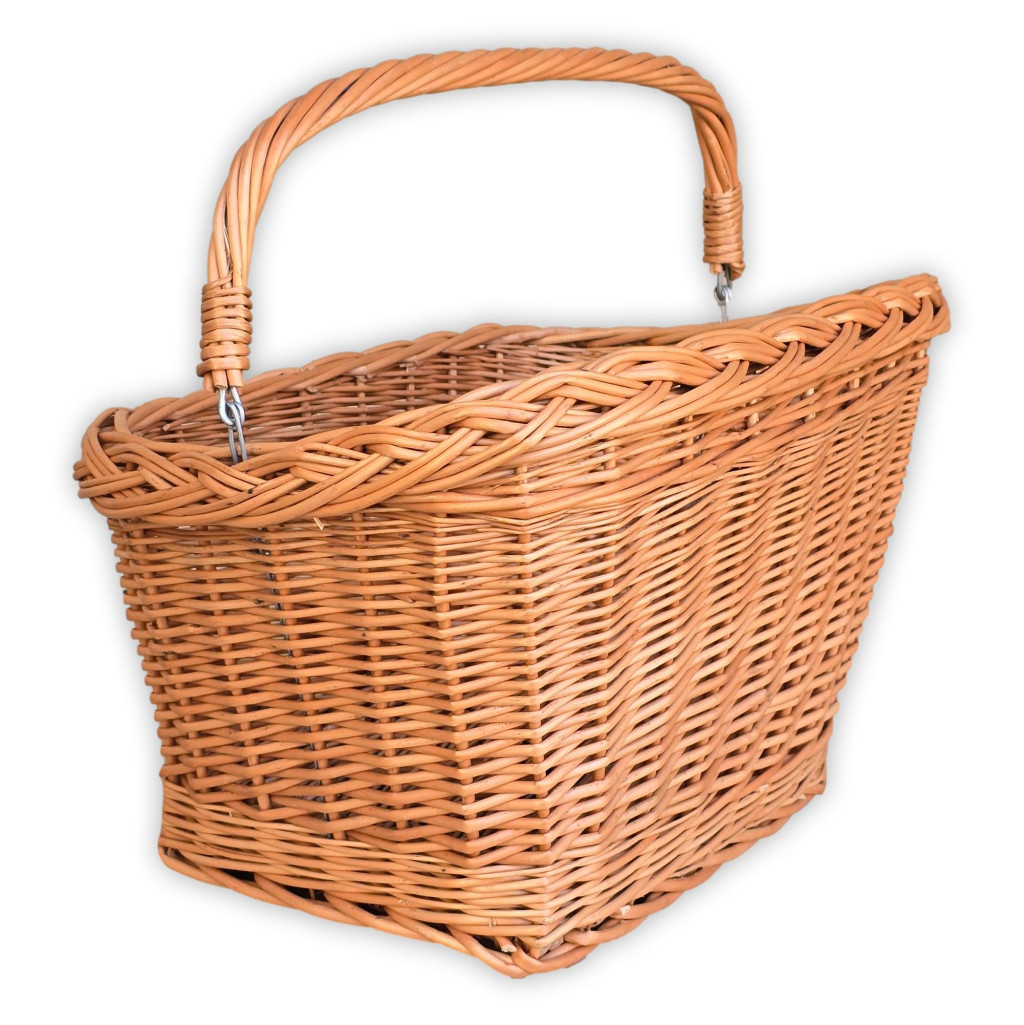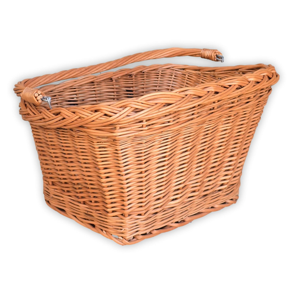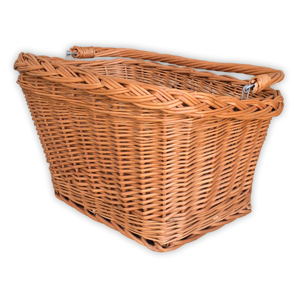 Vesszőből fonott, szögletes alapú kerékpár kosár megemelt orr résszel és lehajtható füllel.