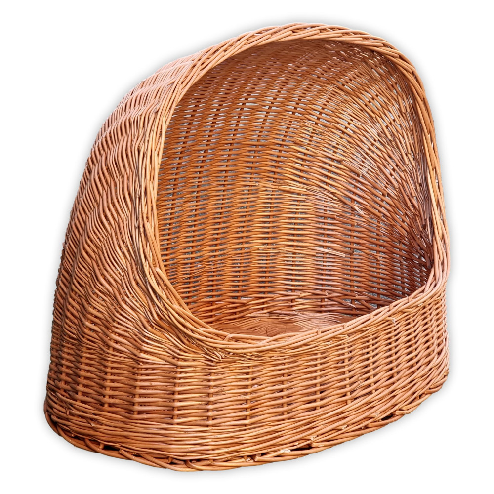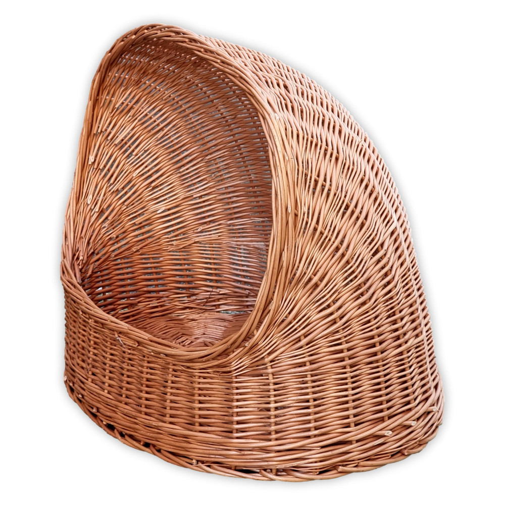 Hunde- oder Katzenbett aus natürlichem Weidengeflecht. Die gewölbte Form der Höhle bietet Schutz und einen gemütlichen Rückzugsort, in dem das Haustier ruhig entspannen kann. Das natürliche Material und die handwerkliche Flechttechnik verleihen dem Produkt ein angenehmes und warmes Aussehen.