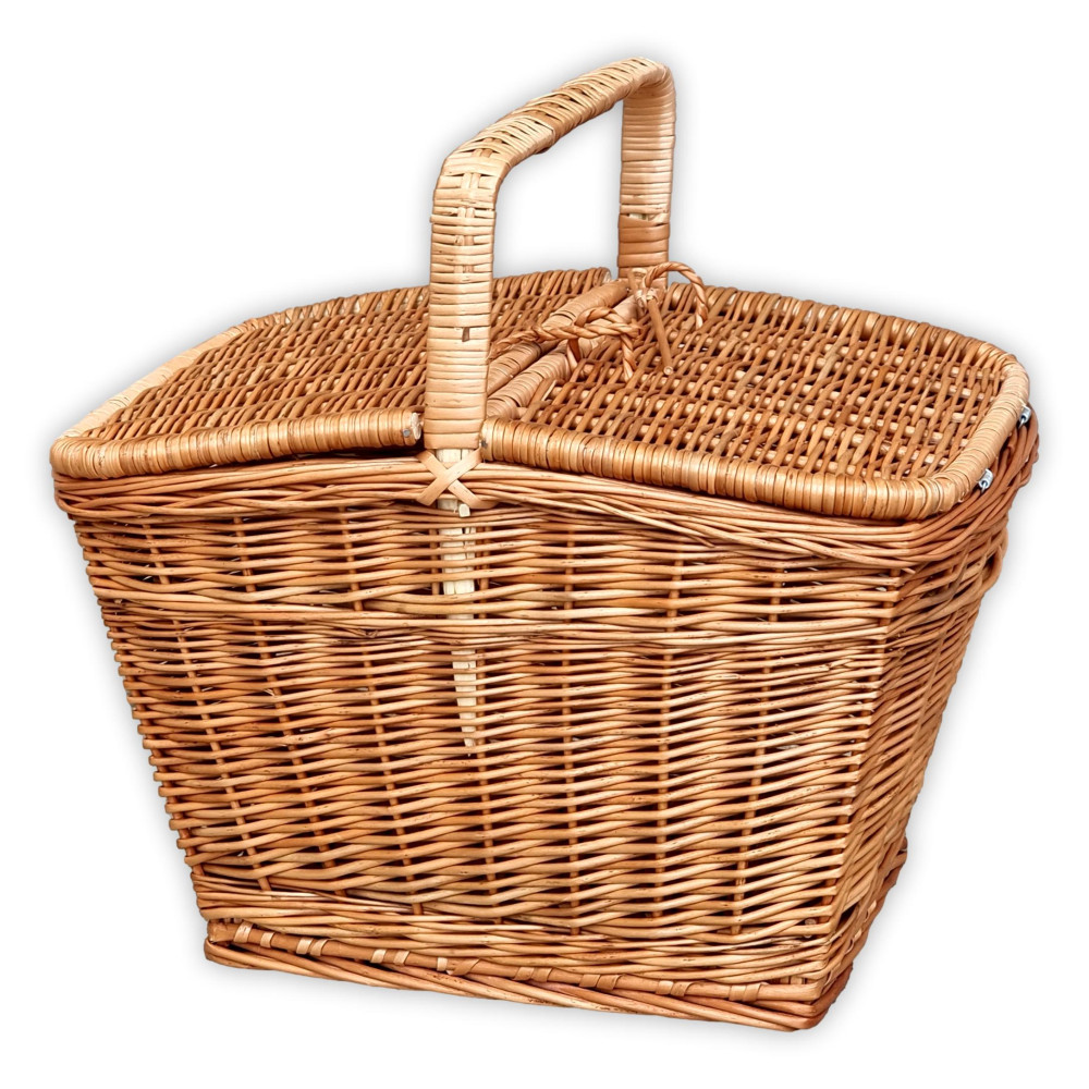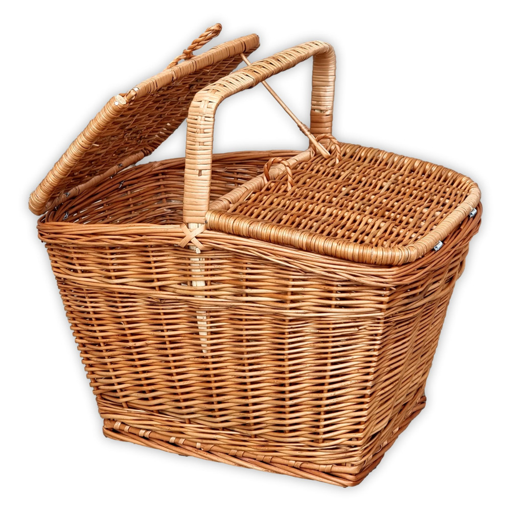 Besonderer Picknickkorb mit nach außen öffnendem Deckel.
