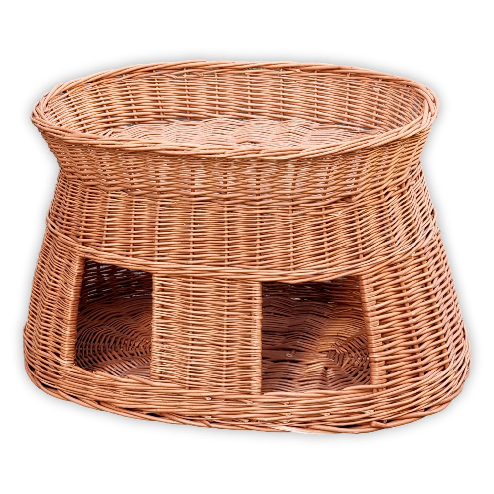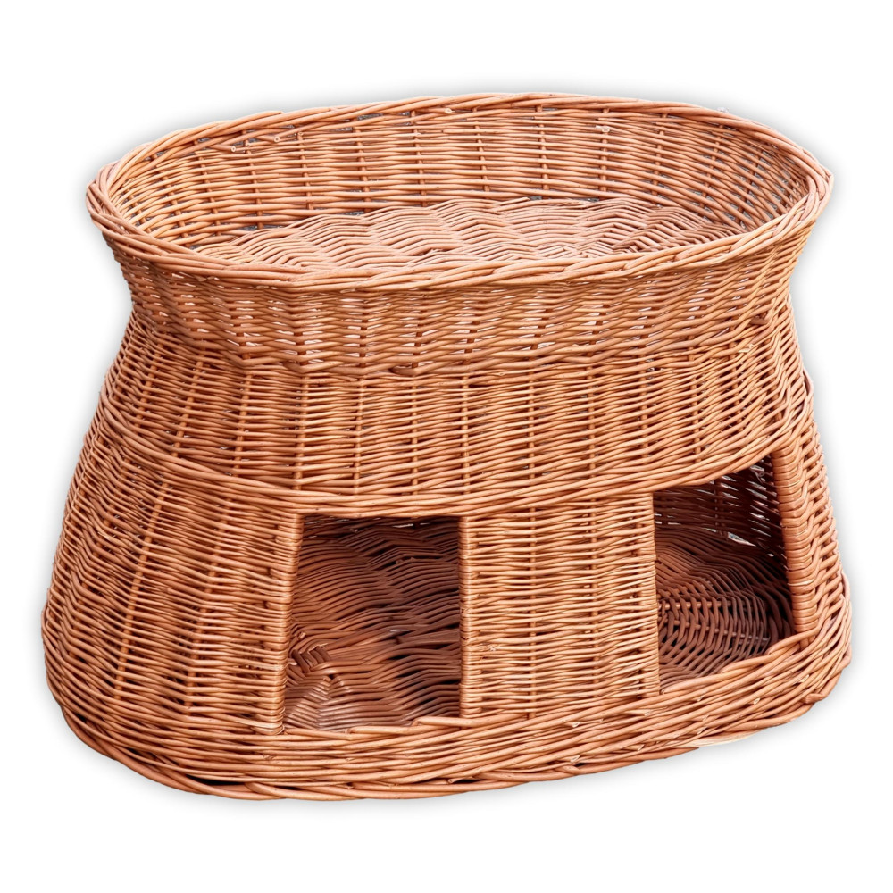 Katzenbett mit Doppel-Eingang und unterer sowie oberer Ebene, hergestellt aus natürlichem Weidengeflecht. Das klassische Flechtmuster und die Verwendung von natürlichem Material verleihen eine ästhetische Optik, sodass das Bett neben seiner Praktikabilität auch ein dekoratives Element in der Wohnung sein kann.