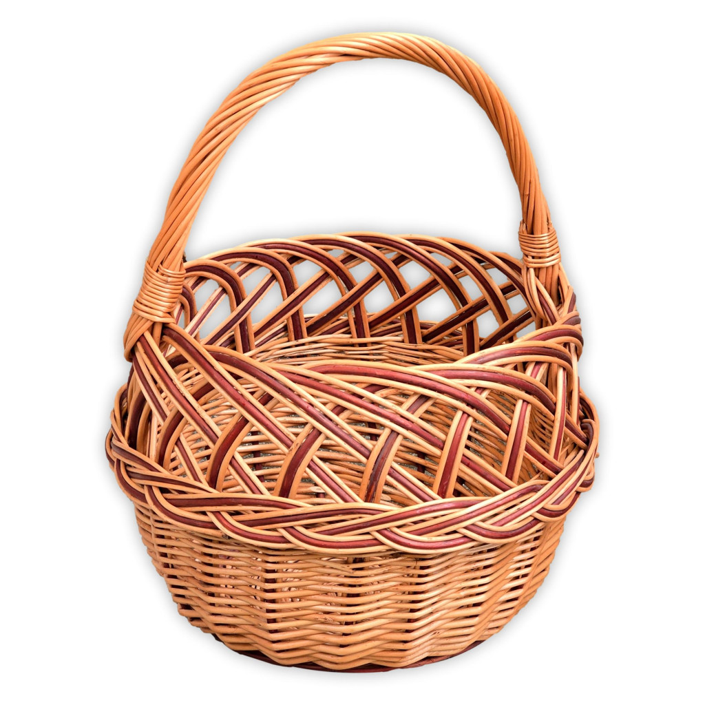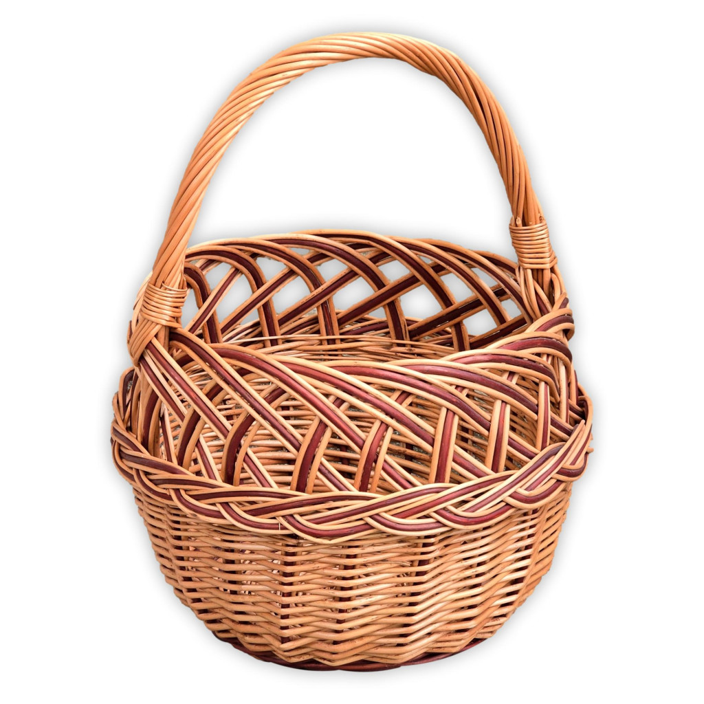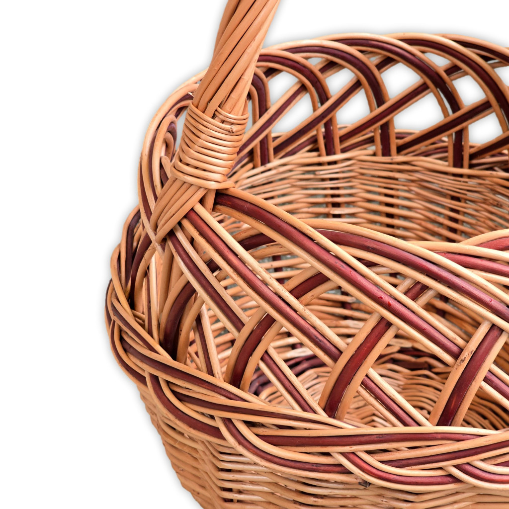 Handgefertigter kugelförmiger Einkaufskorb aus Weidengeflecht. Mit Spitzenmuster auf der Oberseite und Weidengeflechtverzierung an den Seiten.