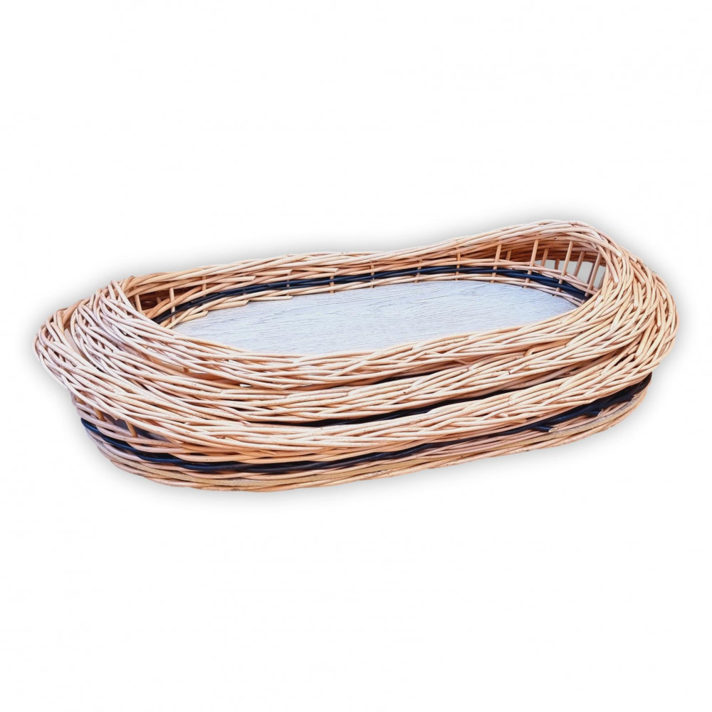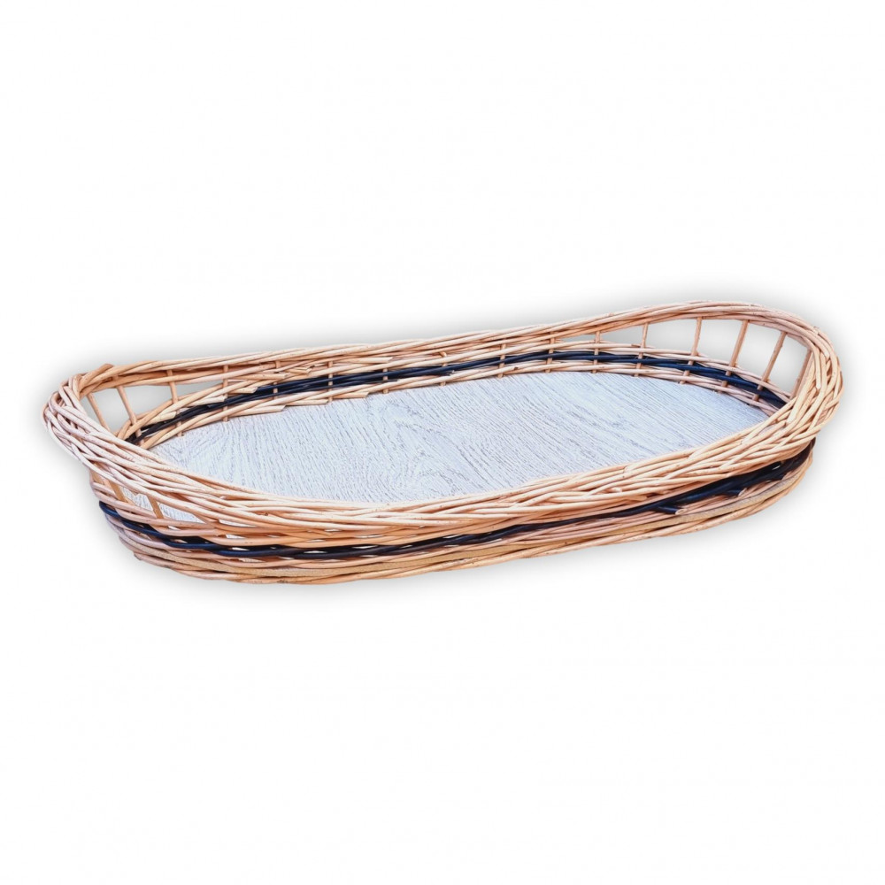 Ovales Serviertablett mit gemustertem Holzfurnier auf der Unterseite.