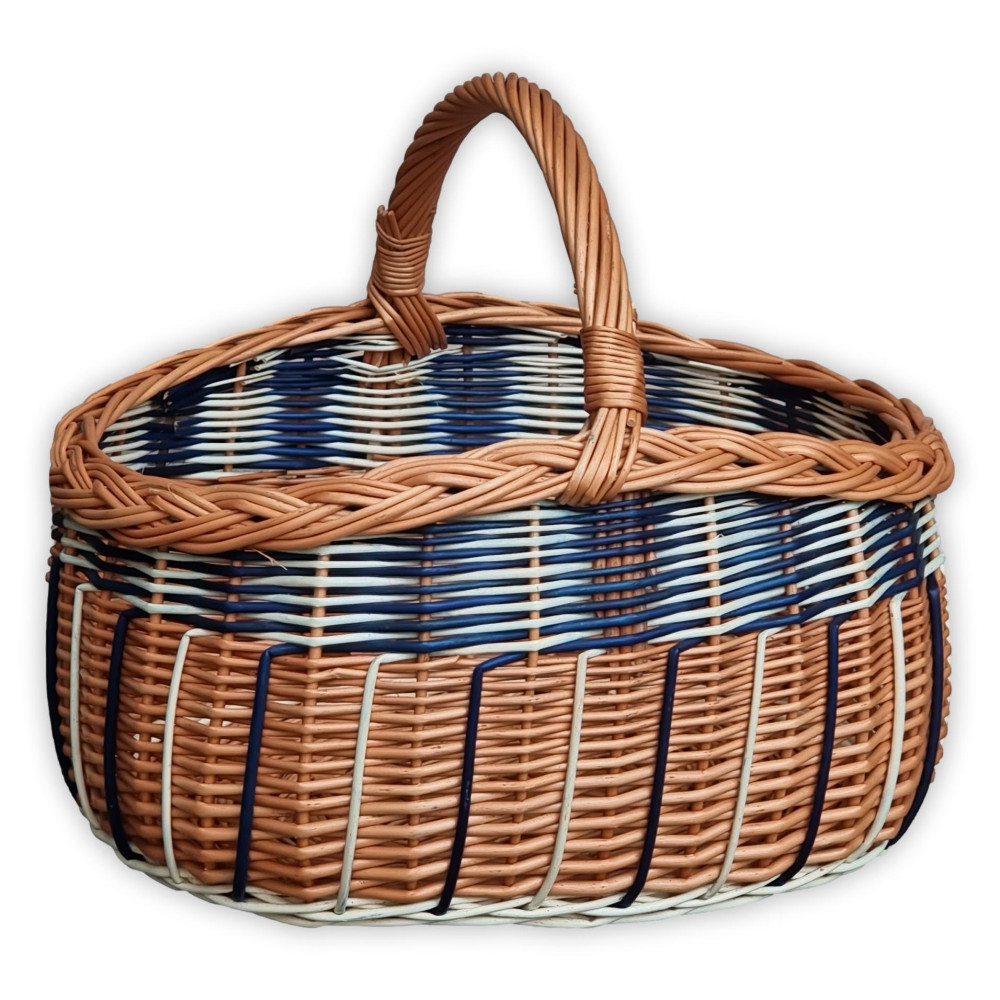 Einkaufskorb aus Weide mit blauer und weißer Dekoration.