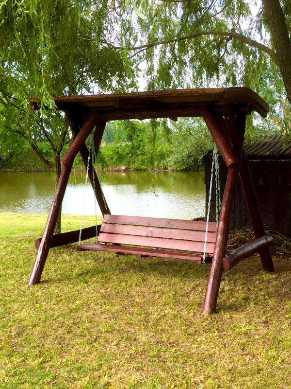 Schaukelbett aus Akazienstämmen mit Strohdach.