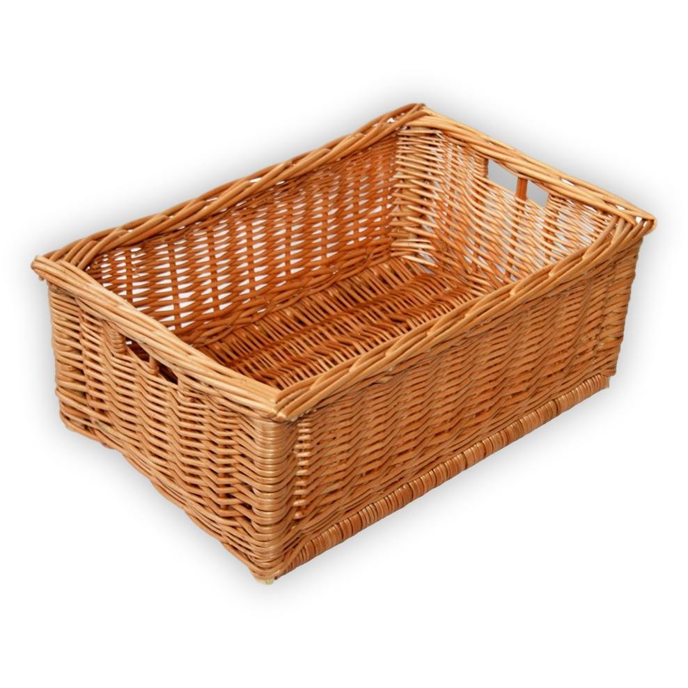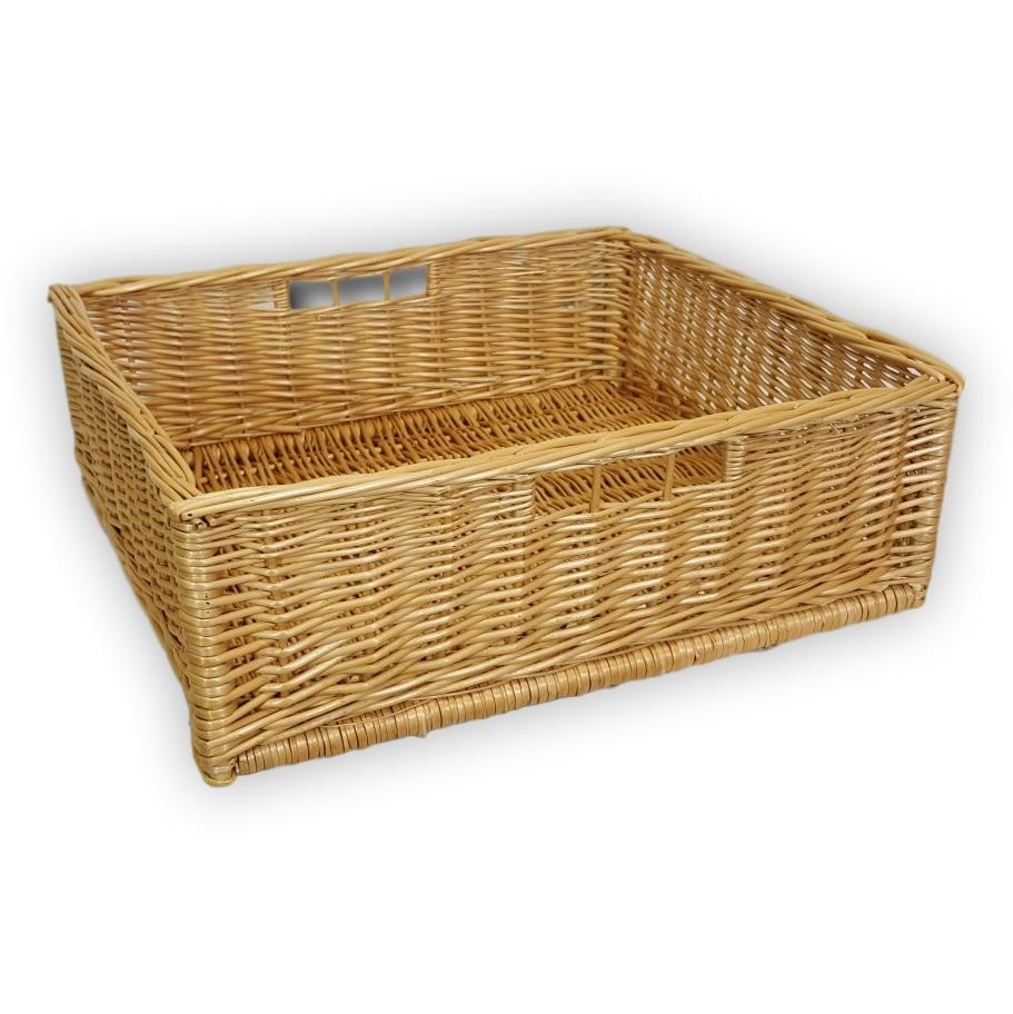 Quadratische Aufbewahrungstruhe aus Weidengeflecht.