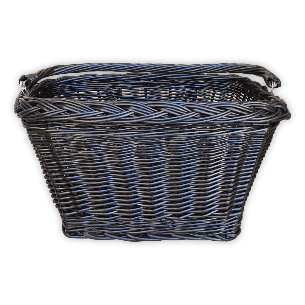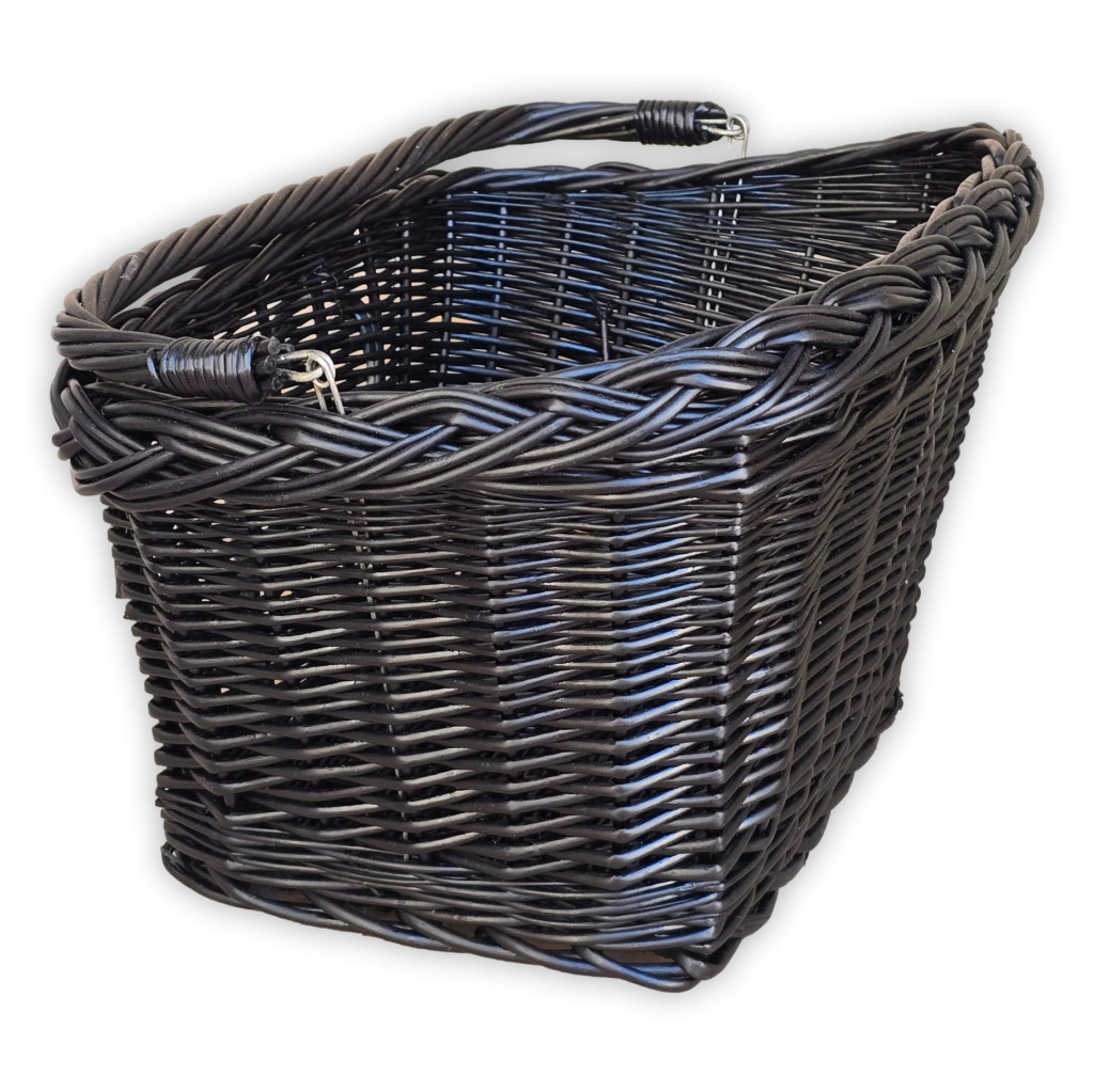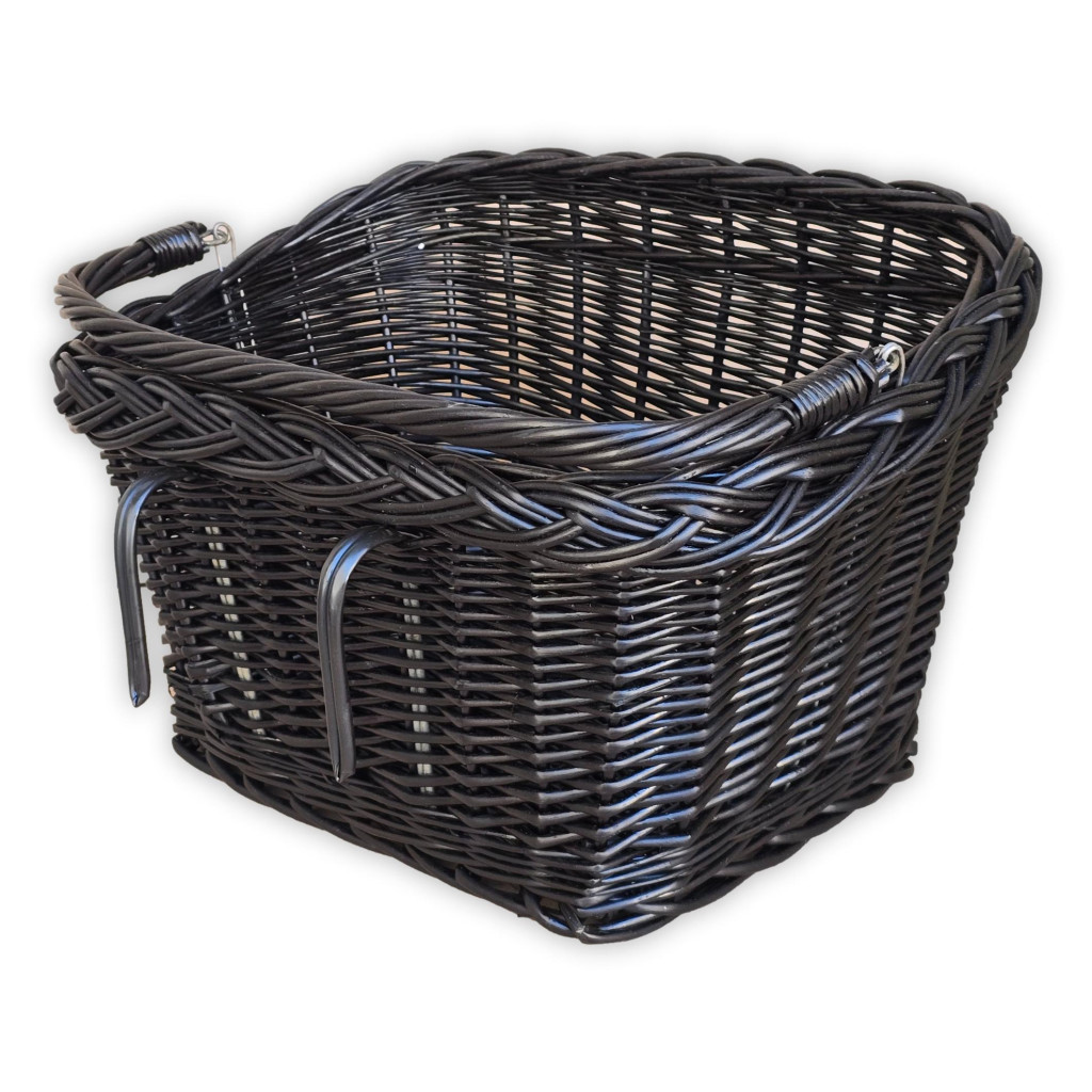 Vesszőből fonott, kormányra akaszható szögletes alapú kerékpár kosár lehajtható füllel.