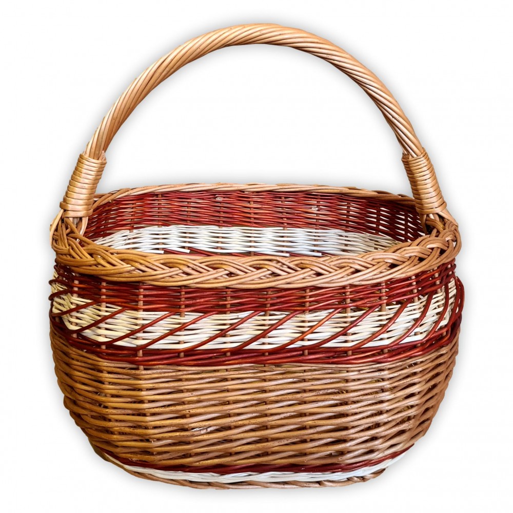 Wicker shopping basket with longitudinal handle, decorated with red and white stripes on the sides, decorated with stick weaving.