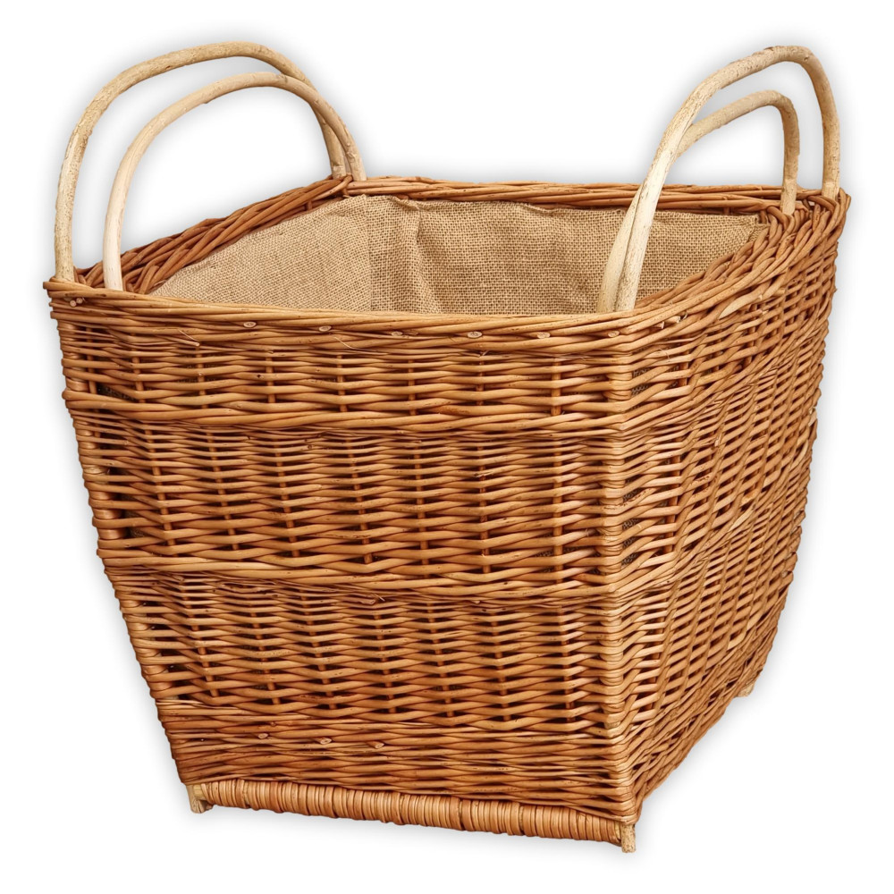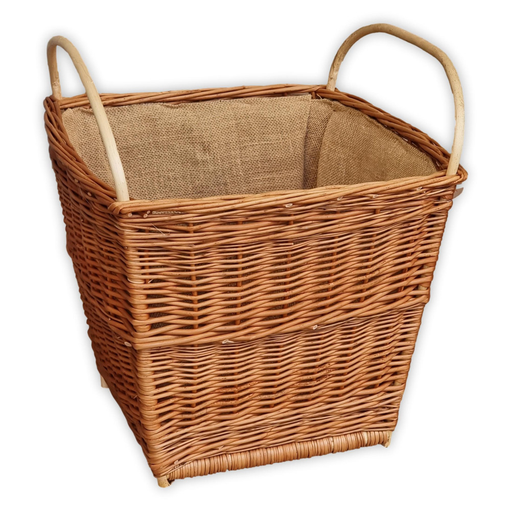 Szögletes formájú, magasított falú két emberes fahordó kosár zsákvászon béléssel.